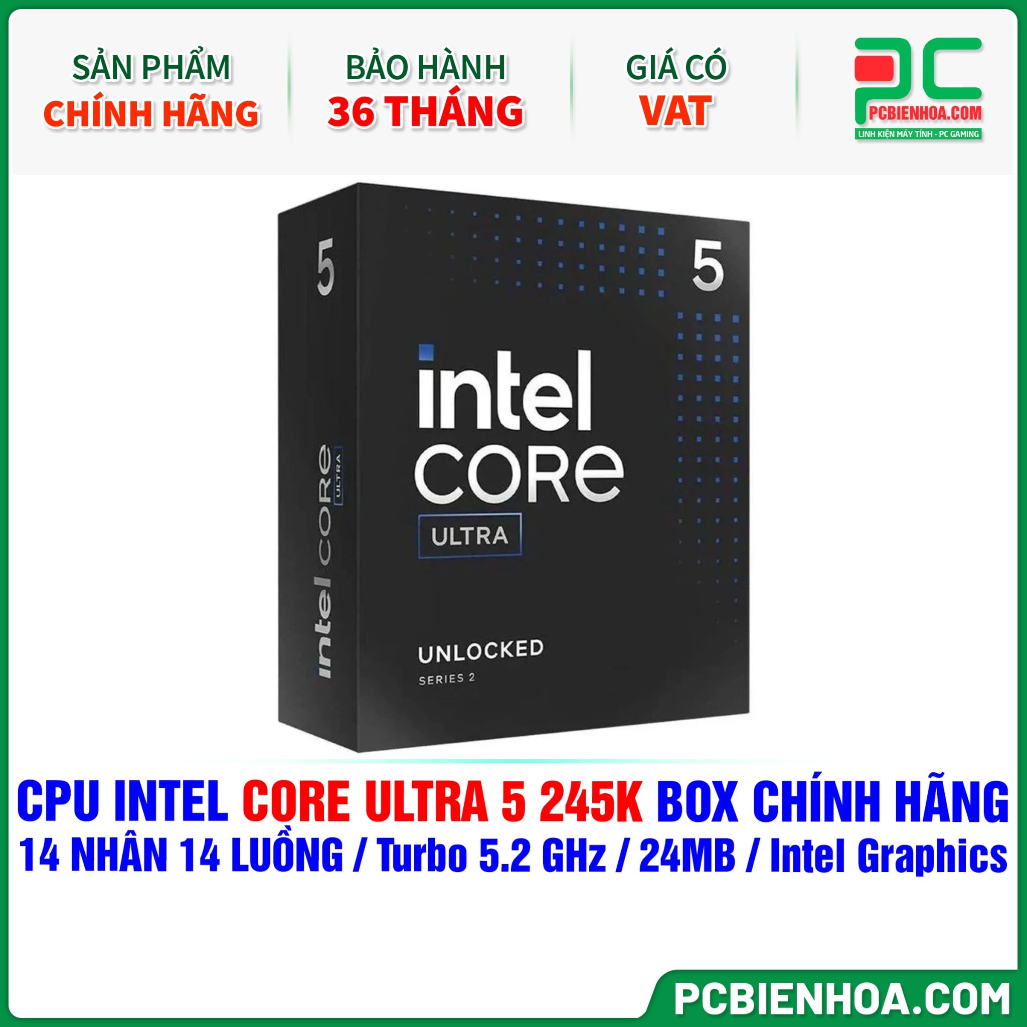 CPU Intel Core Ultra 5 245K BOX CHÍNH HÃNG ( 14 NHÂN 14 LUỒNG / Turbo 5.2 GHz / 24MB / Intel Graphics )