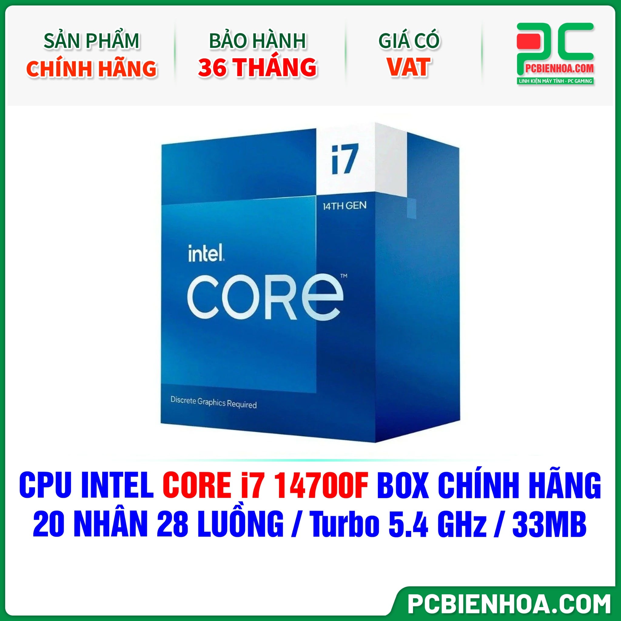 CPU Intel Core i7 14700F BOX CHÍNH HÃNG ( 20 NHÂN 28 LUỒNG / Turbo 5.4 GHz / 33MB )