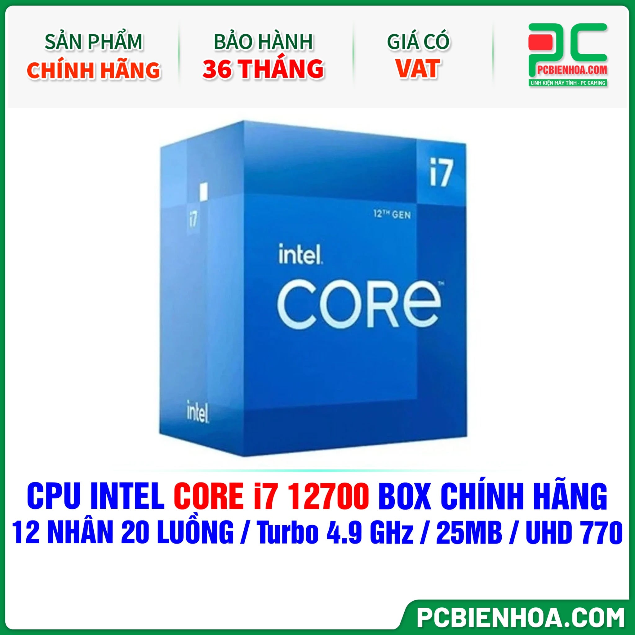 CPU INTEL CORE i7 12700 BOX CHÍNH HÃNG ( 12 NHÂN 20 LUỒNG / Turbo 4.9 GHz / 25MB / UHD GRAPHICS 770 )