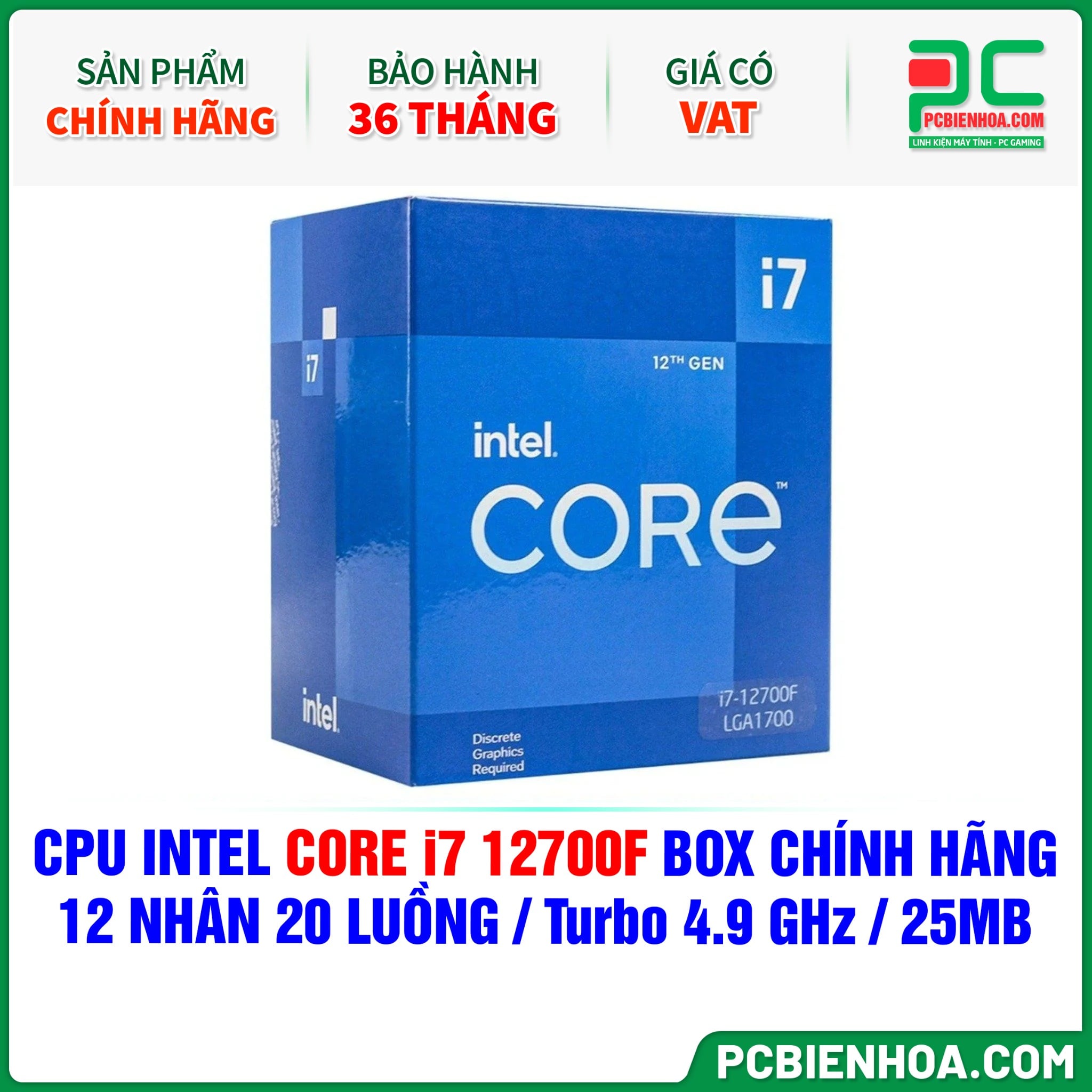 CPU INTEL CORE i7 12700F BOX CHÍNH HÃNG ( 12 NHÂN 20 LUỒNG / Turbo 4.9 GHz / 25MB )