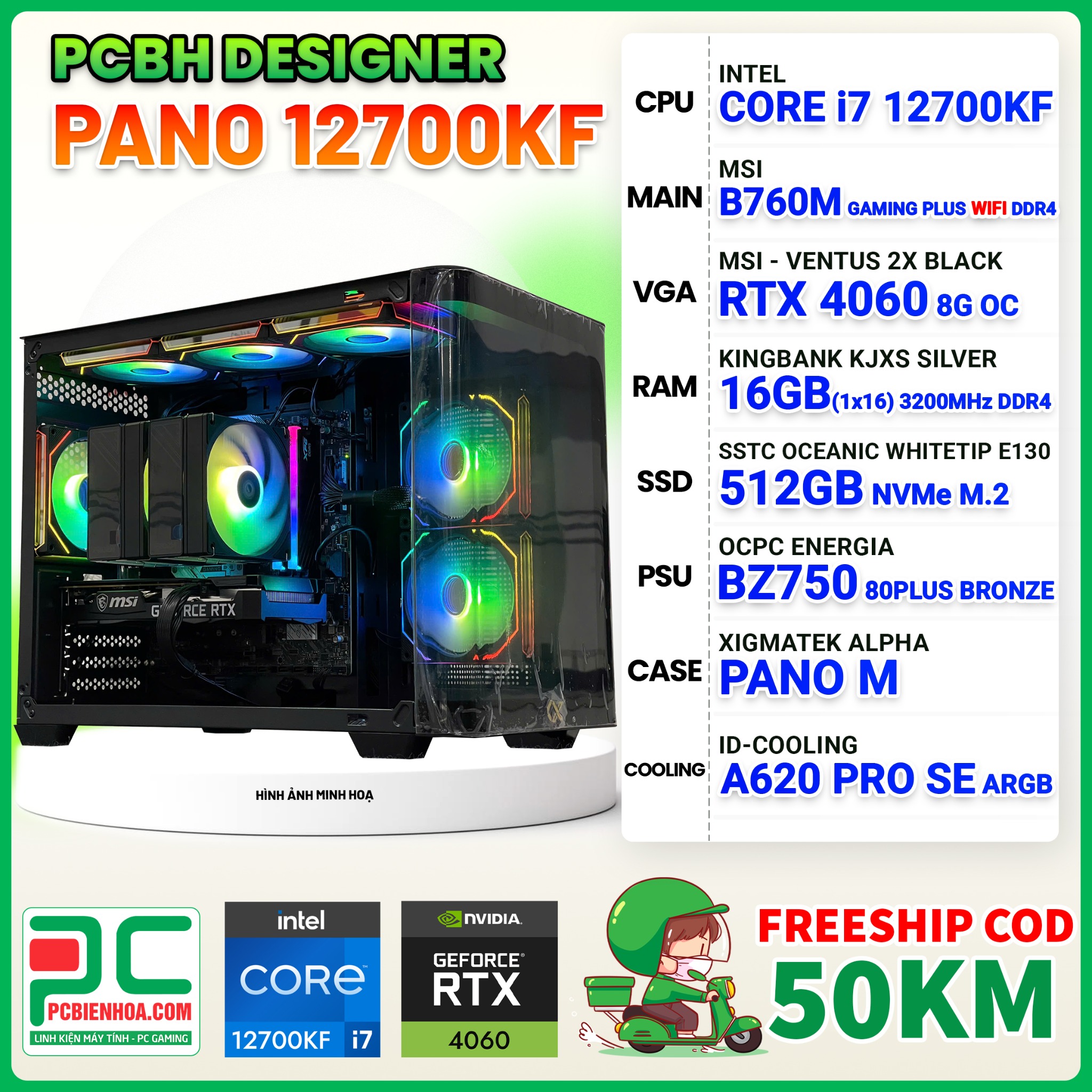 + So sánhPCBH DESIGNER PANO CORE i7 12700KF / B760M WiFi / RTX 4060 8GB / 16GB / 512GB
