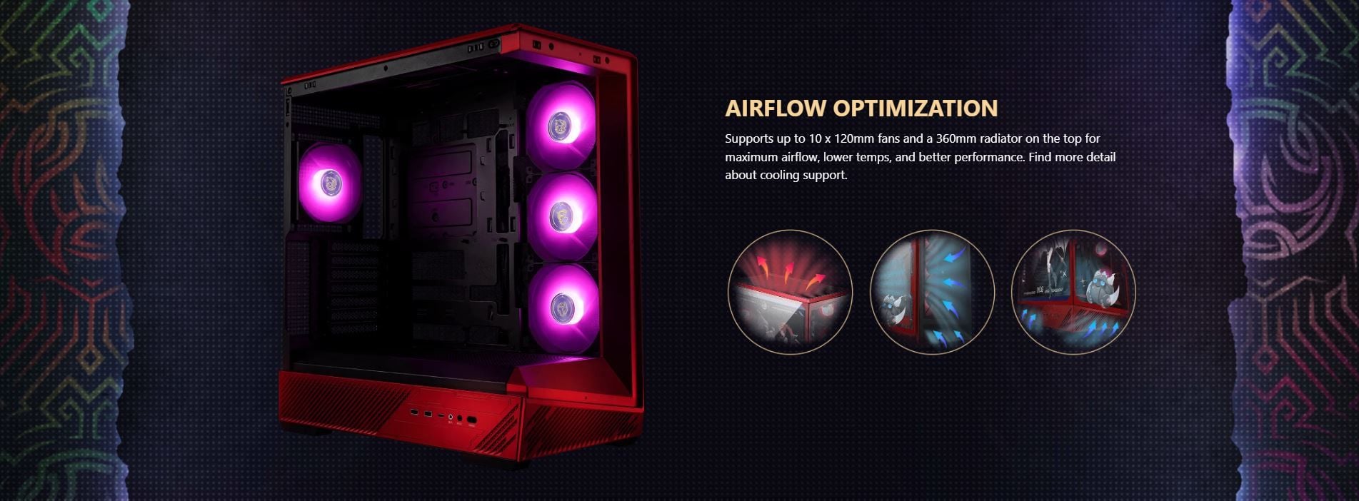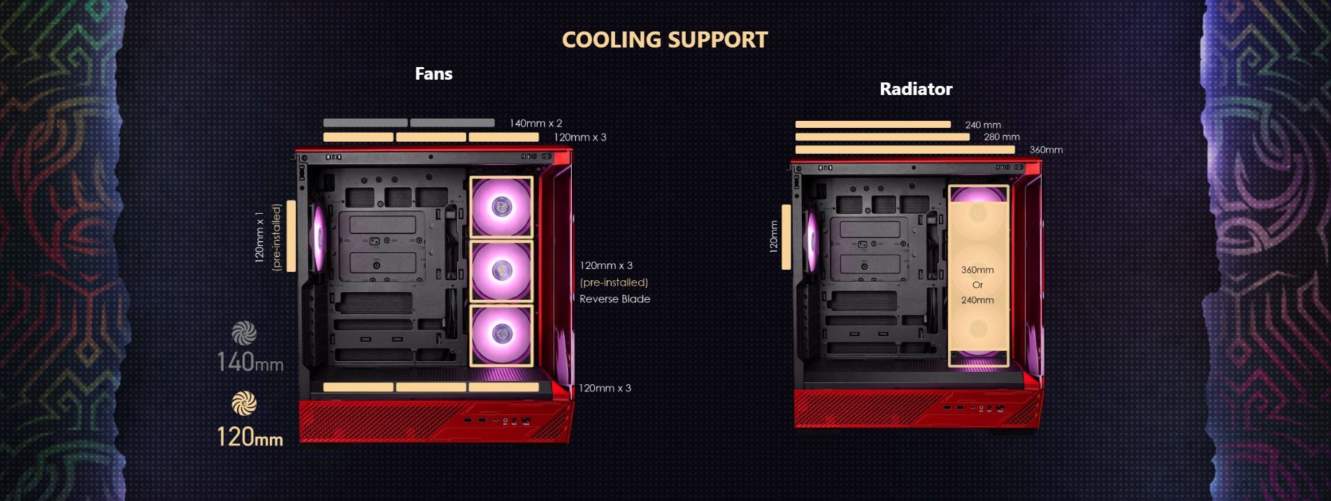 FAN SIZE SUPPORT | Top: 3 x 120 mm / 2 x 140 mm Front: N/A Rear: 1 x 120 mm Side: 3 x 120 mm Bottom: 3 x 120 mm (Above the power shroud) |