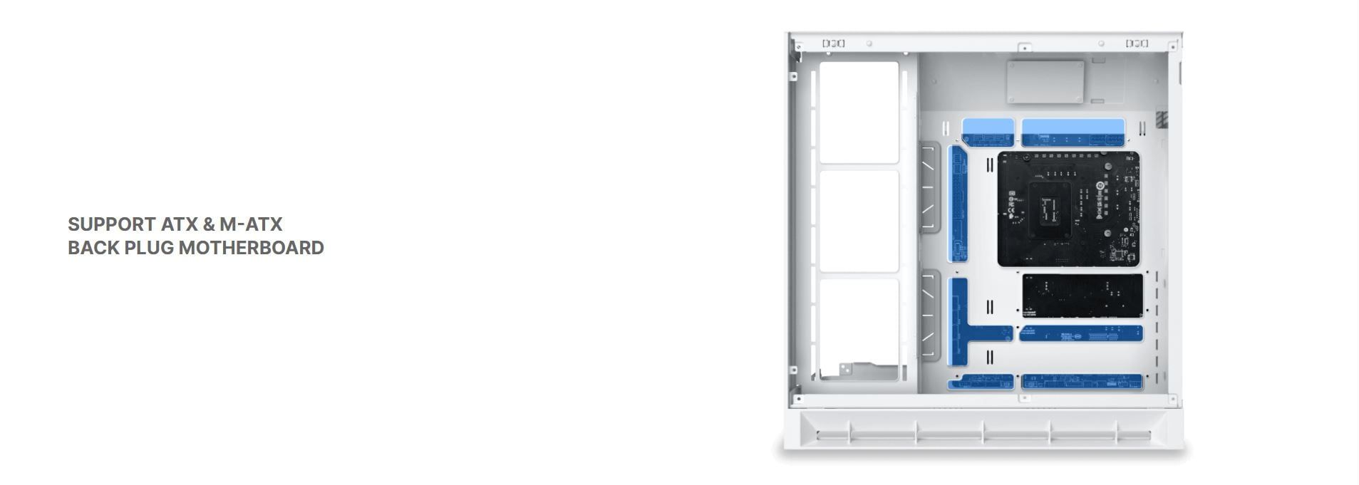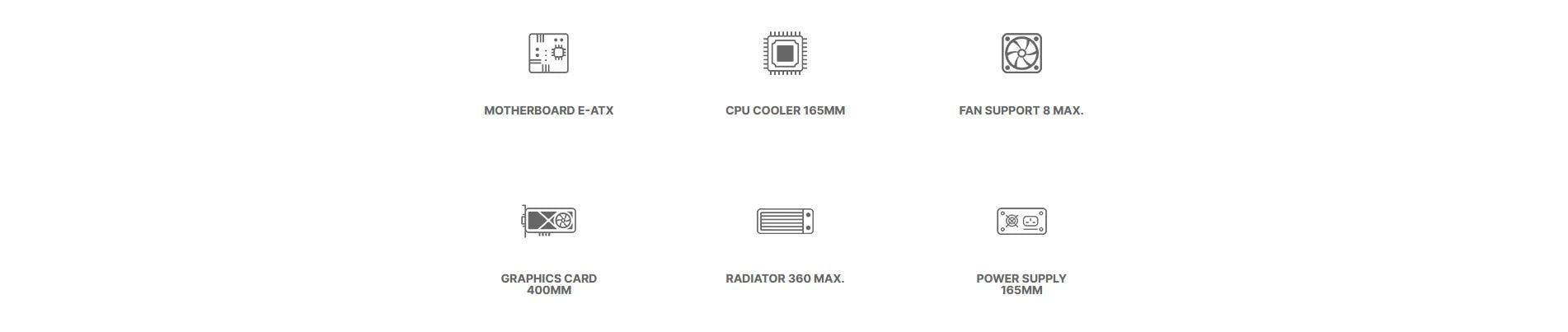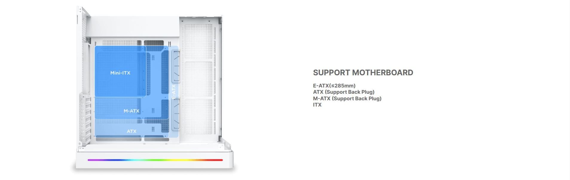 Hỗ trợ Mainboard | E-ATX (≤ 285mm), ATX (hỗ trợ back plug), M-ATX (hỗ trợ back plug), ITX |