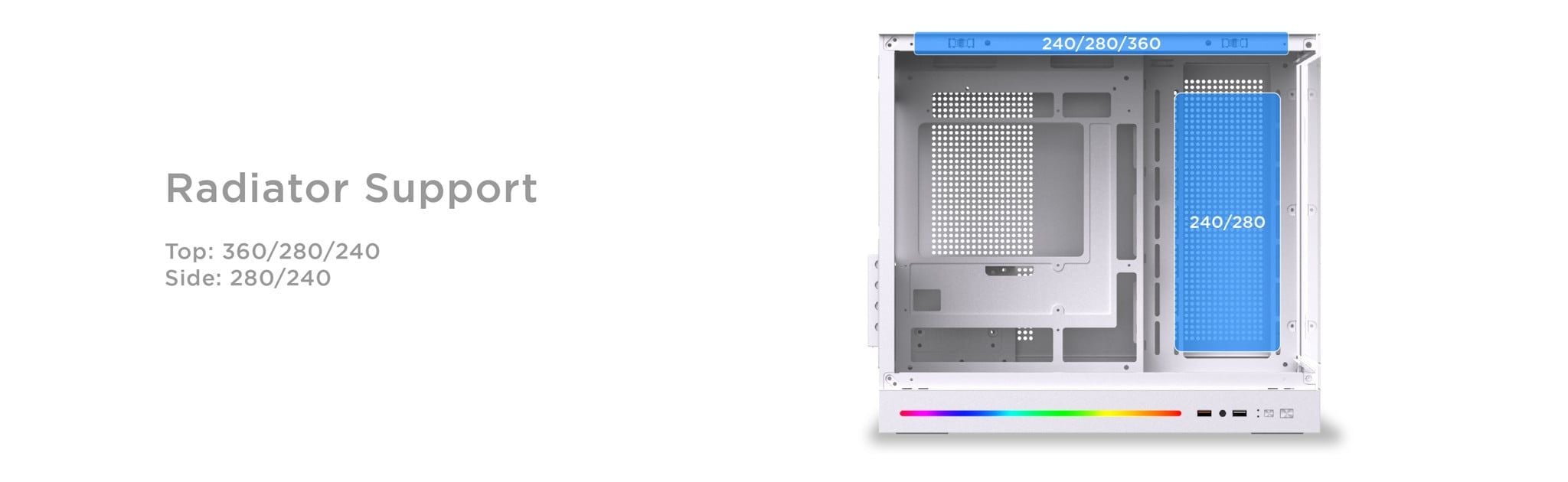 Hỗ trợ tản nhiệt nước (Radiator) | Trên (Top): 360 / 280 / 240mm |
