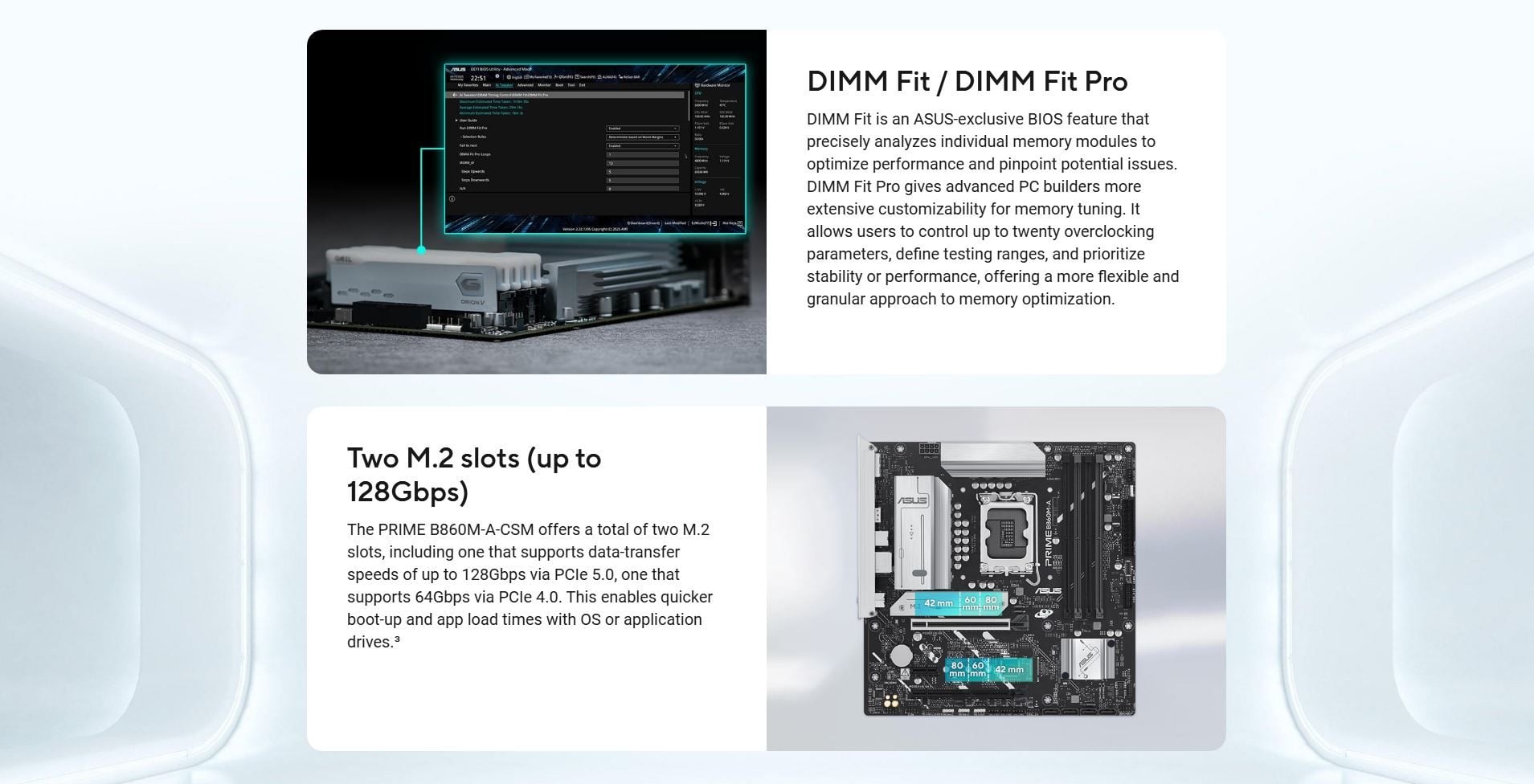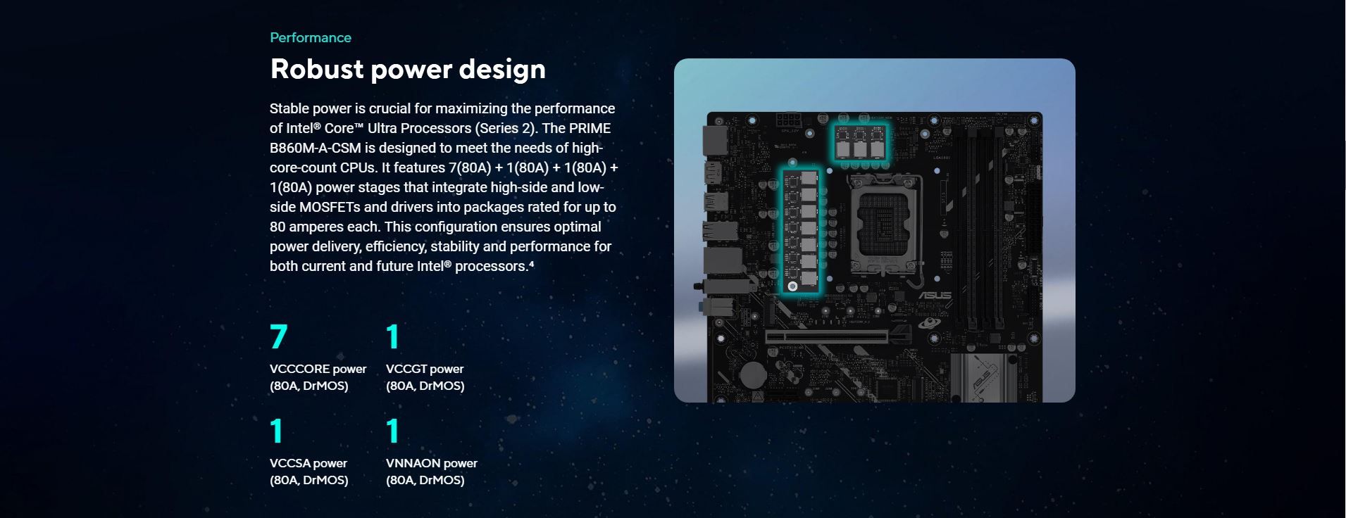 Expansion Slots | Intel® Core™ Ultra Processors(series 2)* 1 x PCIe 5.0 x16 slot Intel® B860 Chipset 1 x PCIe 4.0 x16 slot (supports x4 mode) 1 x PCIe 4.0 x1 slot - To ensure compatibility of the device installed, please refer to https://www.asus.com/support/download-center/ for the list of supported peripherals. |
