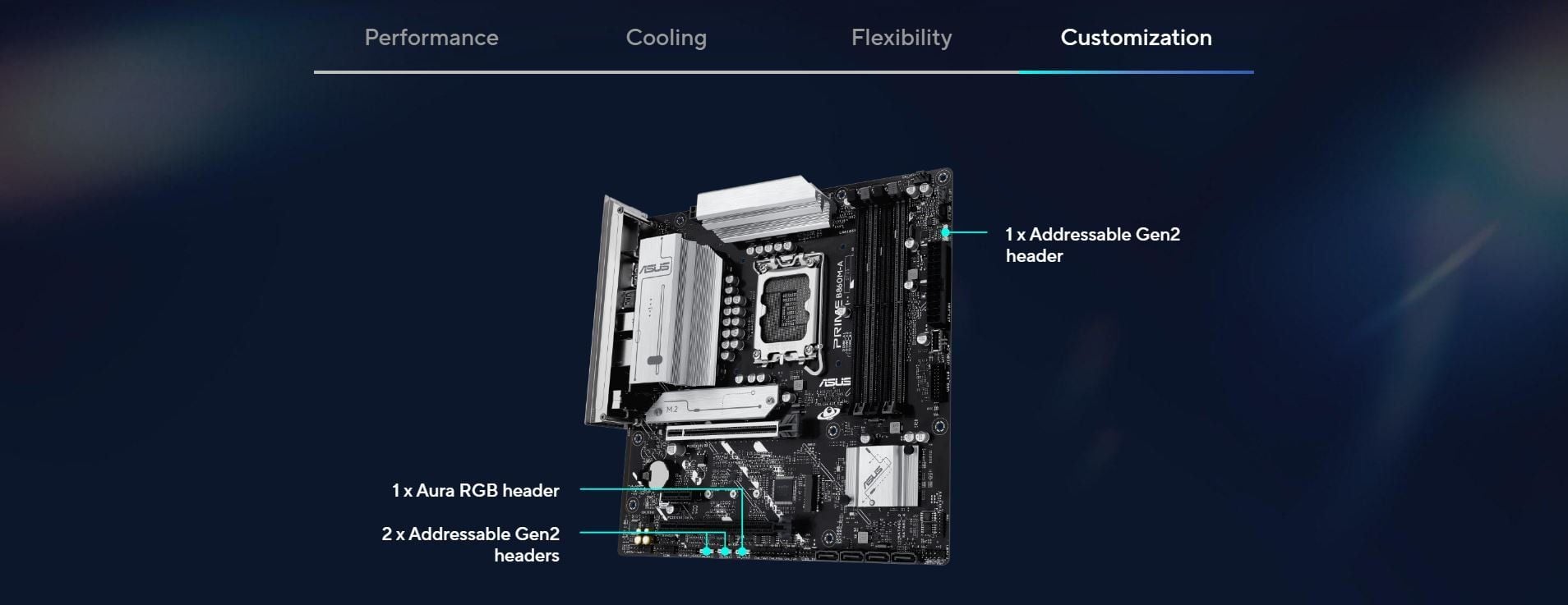 Internal I/O Connectors | Fan and Cooling Related 1 x 4-pin CPU Fan header 1 x 4-pin CPU OPT Fan header 1 x 4-pin AIO Pump header 3 x 4-pin Chassis Fan headers Power Related 1 x 24-pin Main Power connector 1 x 8-pin +12V CPU Power connector Storage Related 2 x M.2 slots (Key M) 4 x SATA 6Gb/s ports USB 1 x USB 10Gbps connector (supports USB Type-C® ) 1 x USB 5Gbps header supports 2 additional USB 5Gbps ports 1 x USB 2.0 header supports 2 additionalUSB 2.0 ports Miscellaneous 3 x Addressable Gen 2 headers 1 x Aura RGB header 1 x Clear CMOS header 1 x Chassis Intrusion header 1 x COM Port header 1 x Front Panel Audio header (F_AUDIO) 1 x S/PDIF Out header 1 x SPI TPM header (14-1 pin) 1 x 10-1 pin Front System Panel header 1 x Thunderbolt™ (USB4®) header |