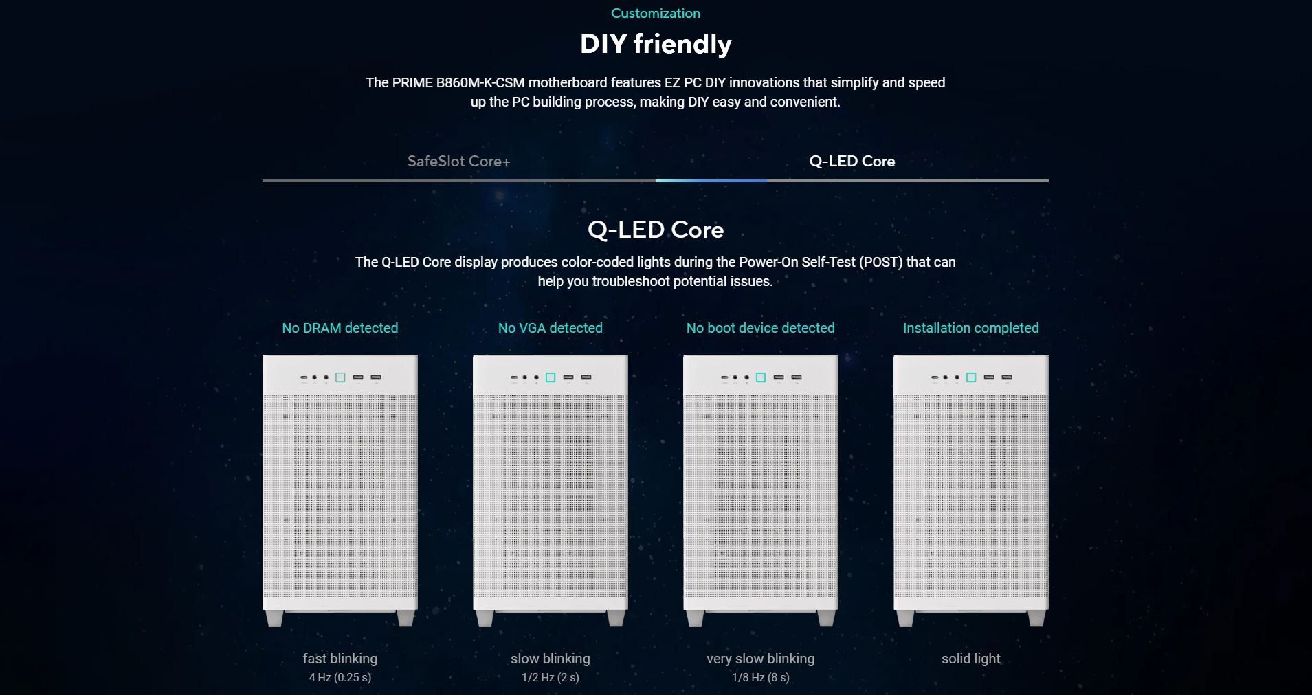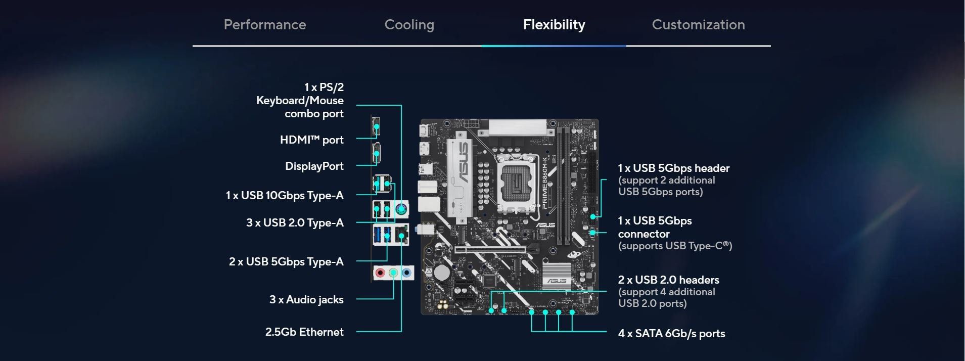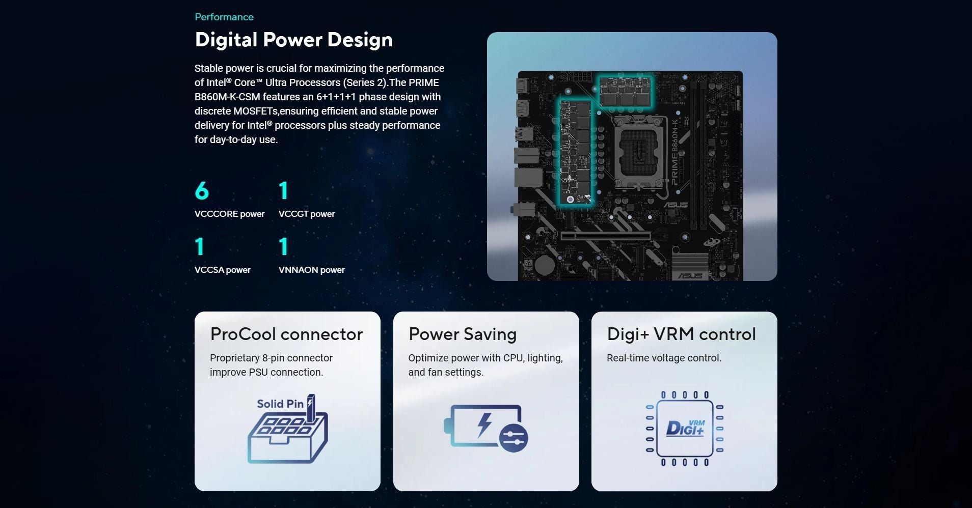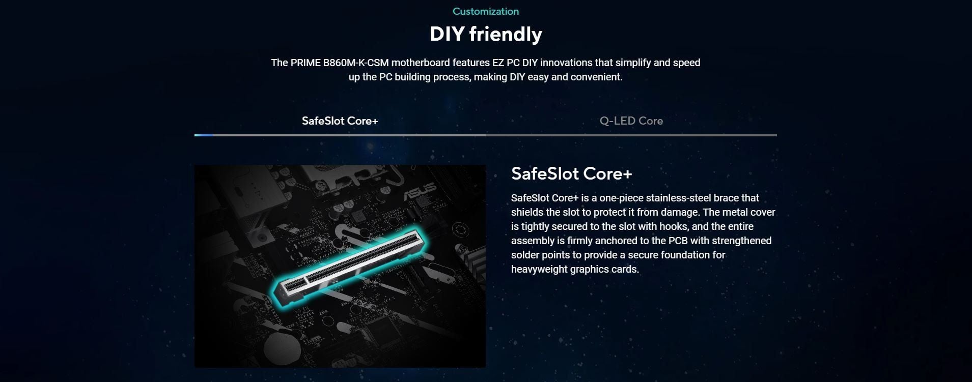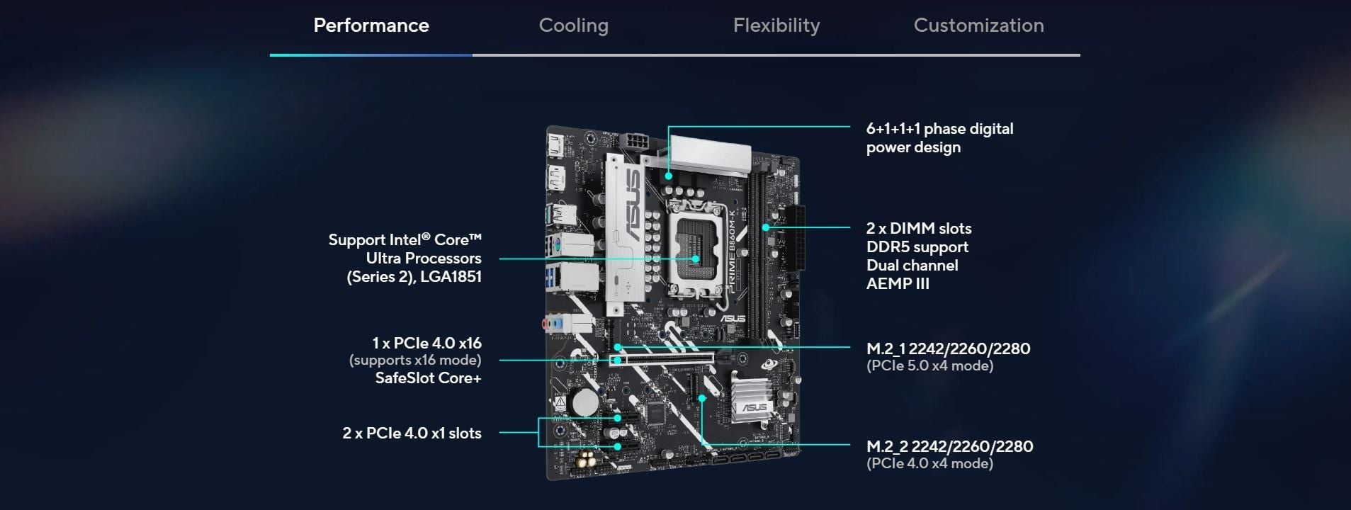 Expansion Slots | Intel® Core™ Ultra Processors (Series 2) 1 x PCIe 4.0 x16 slot Intel® B860 Chipset 2 x PCIe 4.0 x1 slots - To ensure compatibility of the device installed, please refer to https://www.asus.com/support/download-center/ for the list of supported peripherals. |