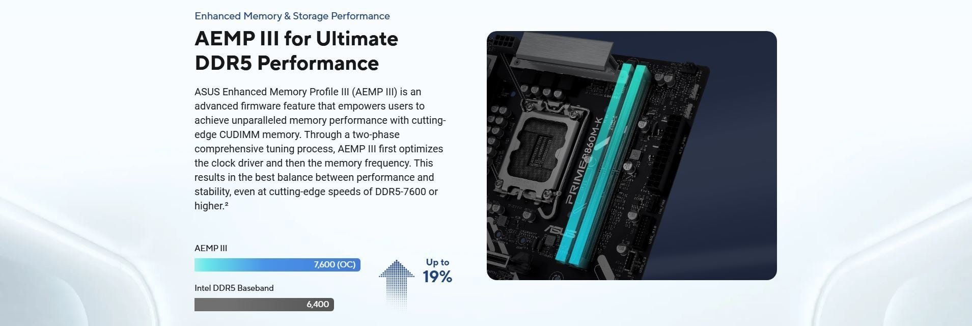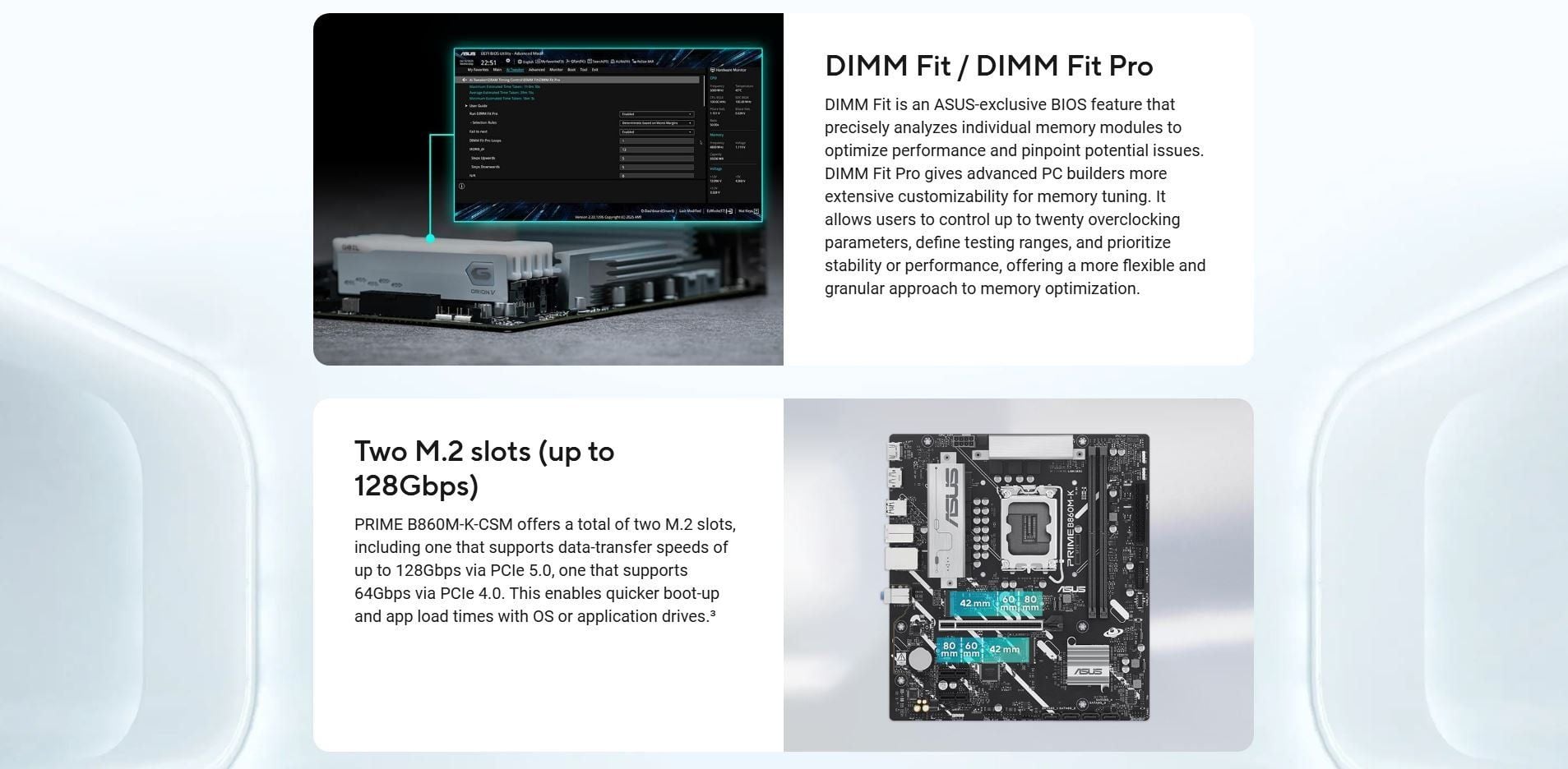 Memory | 2 x DIMM slots, max. 128GB, DDR5 Supports up to 8800+MT/s (OC), Non-ECC, Un-buffered ,Clocked Unbuffered DIMM (CUDIMM)* Dual channel memory architecture DIMM Fit Supports Intel® Extreme Memory Profile (XMP) memory module ASUS Enhanced Memory Profile III(AEMPIII) * Supported memory types, data rate (speed), and number of DRAM modules vary depending on the CPU and memory configuration, for more information please refer to CPU/Memory Support list under the Support tab of product information site or visit https://www.asus.com/support/download-center/. Adjustments will be made based on the specifications of mass-produced memory products available on the market. ** Non-ECC, un-buffered DDR5 memory supports On-Die ECC function. |