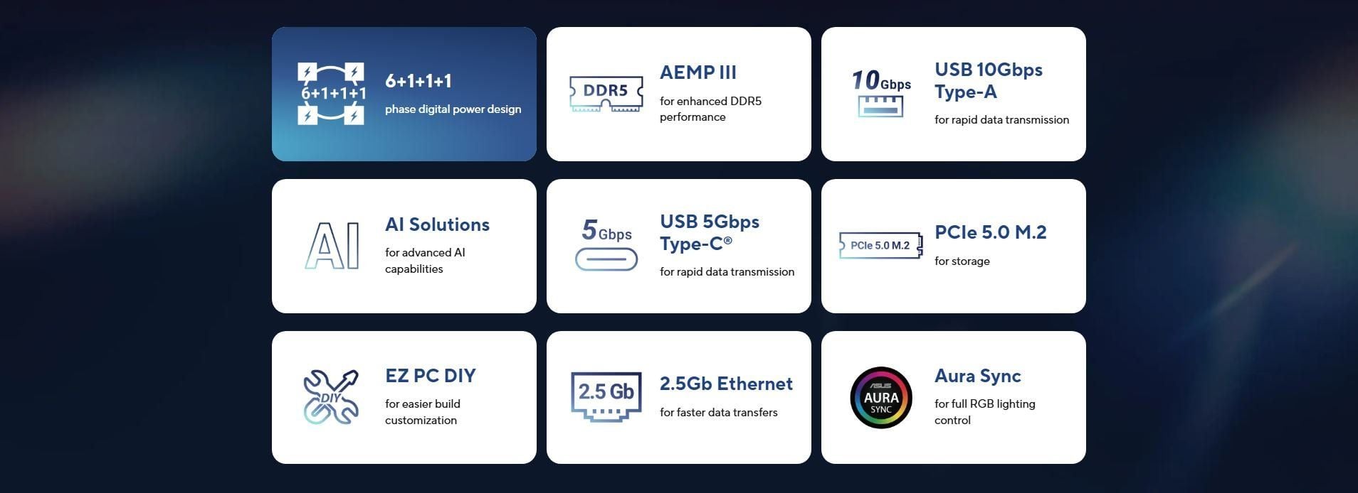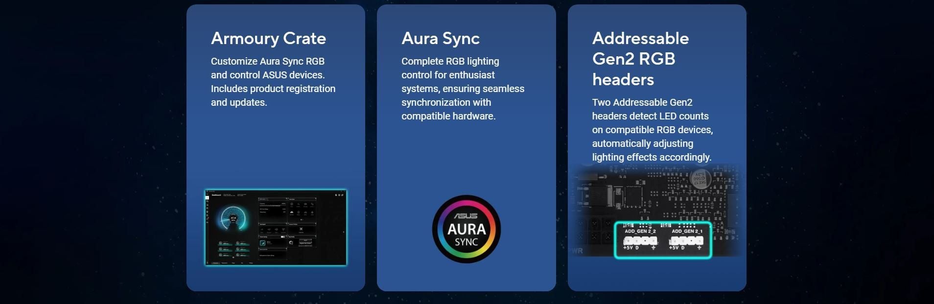 Software Features | ASUS Exclusive Software Armoury Crate - Aura Sync - Fan Xpert 2+ - Power Saving ASUS AI Advisor ASUS DriverHub ASUS CPU-Z Norton 360 Deluxe (60 Days Free Trial) WinRAR (40 Days Free Trial) UEFI BIOS ASUS EZ DIY - ASUS CrashFree BIOS 3 - ASUS EZ Flash - ASUS UEFI BIOS EZ Mode - ASUS MyHotkey |