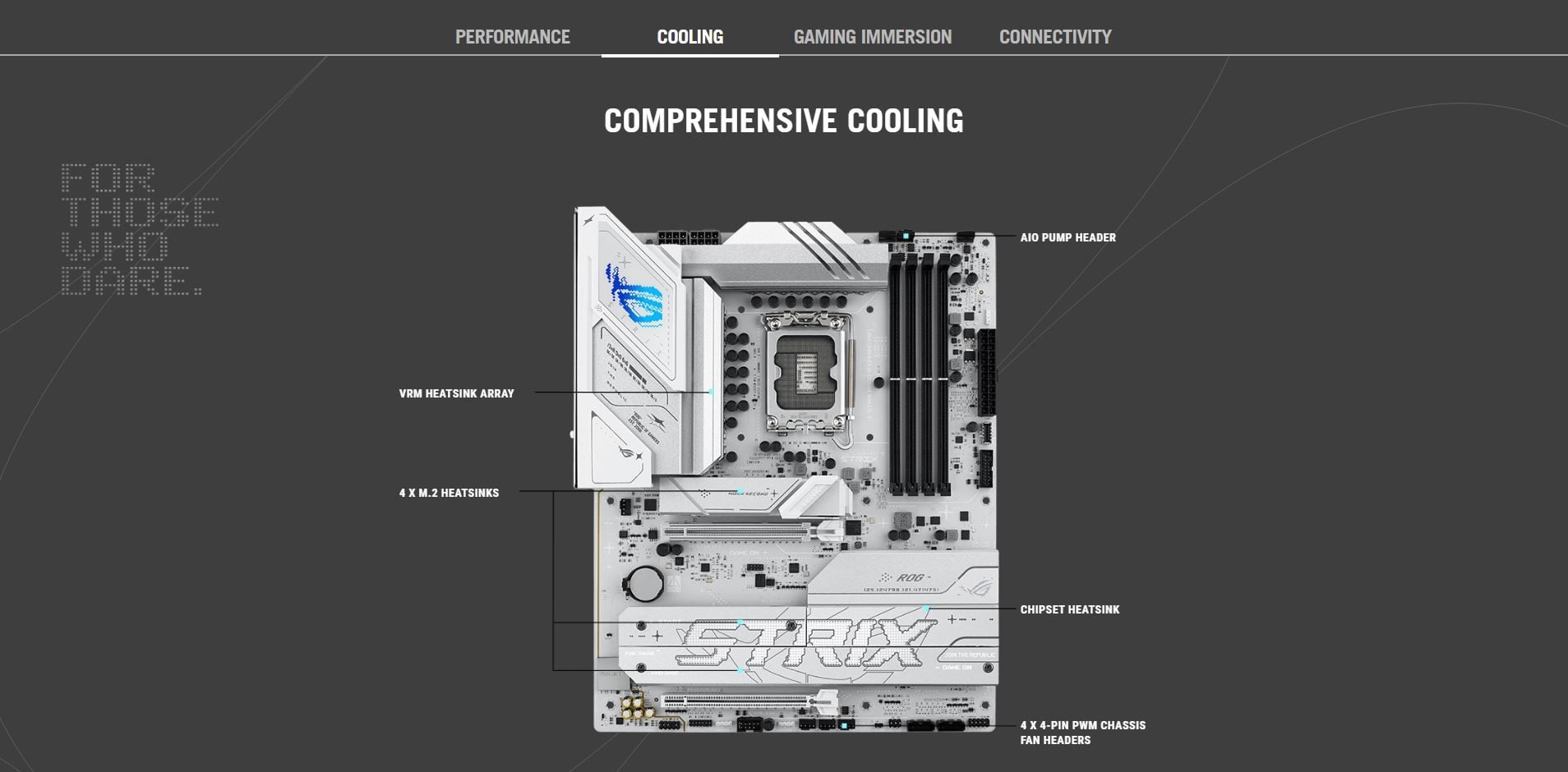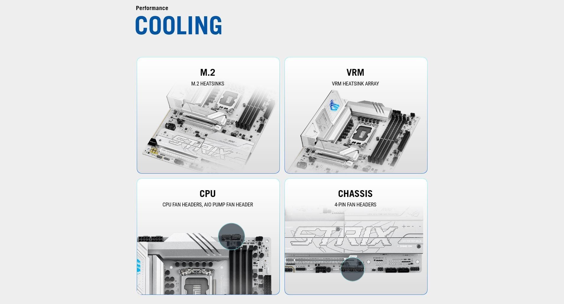 Internal I/O Connectors | Fan and Cooling Related 1 x 4-pin CPU Fan header 1 x 4-pin CPU OPT Fan header 1 x 4-pin AIO Pump header 4 x 4-pin Chassis Fan headers Power Related 1 x 24-pin Main Power connector 2 x 8-pin +12V CPU Power connector Storage Related 4 x M.2 slots (Key M) 4 x SATA 6Gb/s ports USB 1 x USB 10Gbps connector (supports USB Type-C® ) 1 x USB 5Gbps header supports 2 additional USB 5Gbps ports 1 x USB 2.0 header supports 2 additional USB 2.0 ports Miscellaneous 3 x Addressable Gen2 header(s) 1 x Front Panel Audio header (F_AUDIO) 1 x 10-1 pin Front System Panel header 1 x Thermal Sensor header 1 x Thunderbolt™ (USB4®) header |
