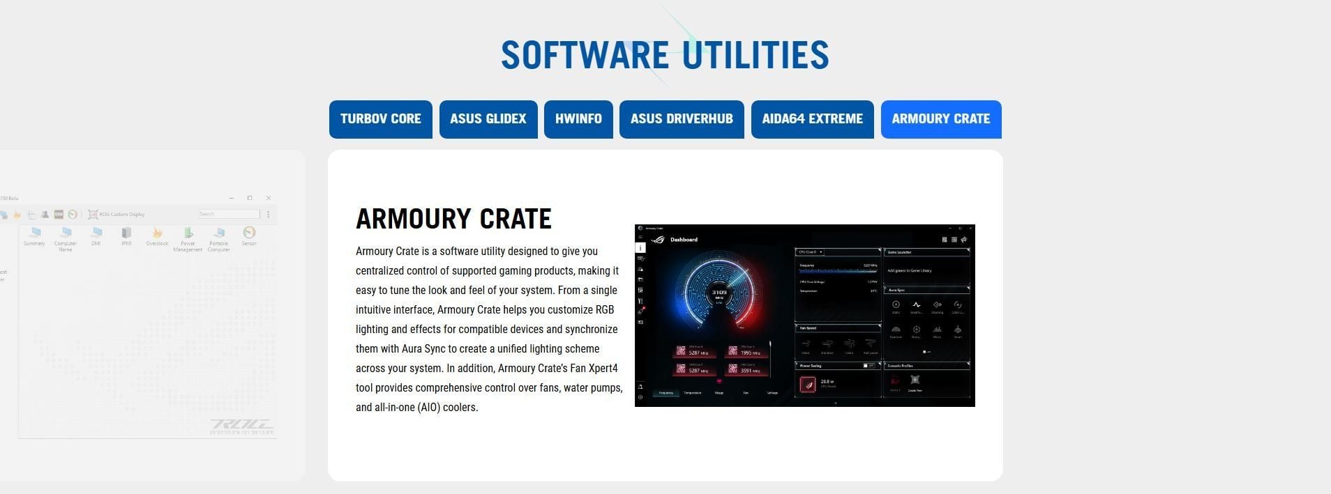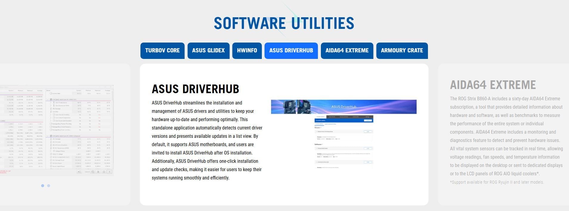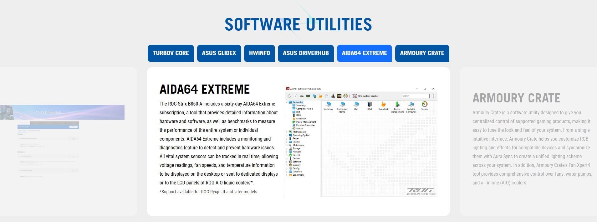 Software Features | ROG Exclusive Software - ROG CPU-Z - Dolby Atmos ASUS Exclusive Software Armoury Crate - Aura Creator - Aura Sync - Fan Xpert 4 - GameFirst - Power Saving AIDA64 Extreme (60 days free trial) HWiNFO ASUS AI Advisor ASUS DriverHub ASUS GlideX TurboV Core Adobe Creative Cloud 30 Days Free Trial) Norton 360 for Gamers (60 Days Free Trial) WinRAR (40 Days Free Trial) UEFI BIOS AI Overclocking Guide ASUS EZ DIY - ASUS CrashFree BIOS 3 - ASUS EZ Flash - ASUS UEFI BIOS EZ Mode - ASUS MyHotkey NPU Boost |