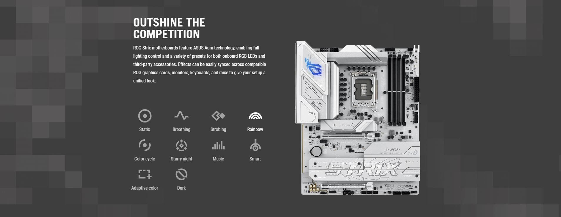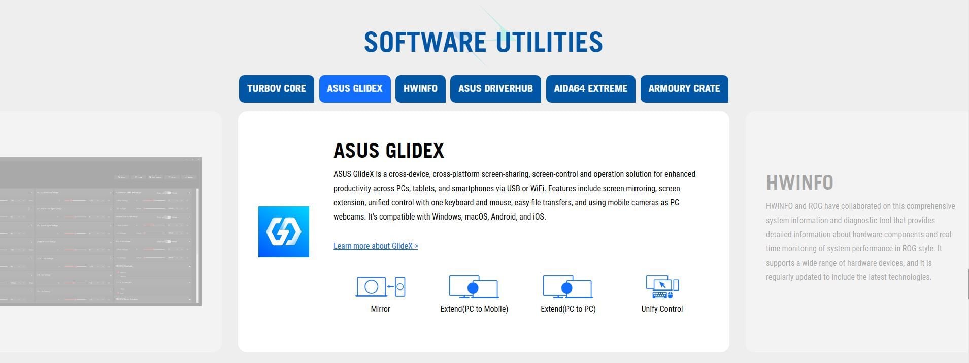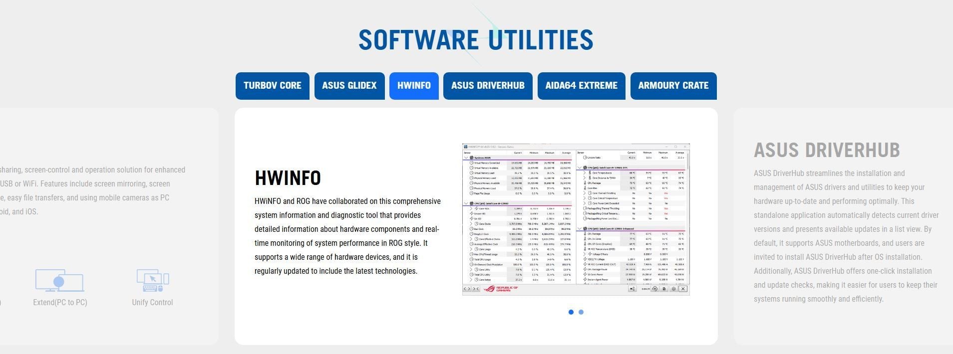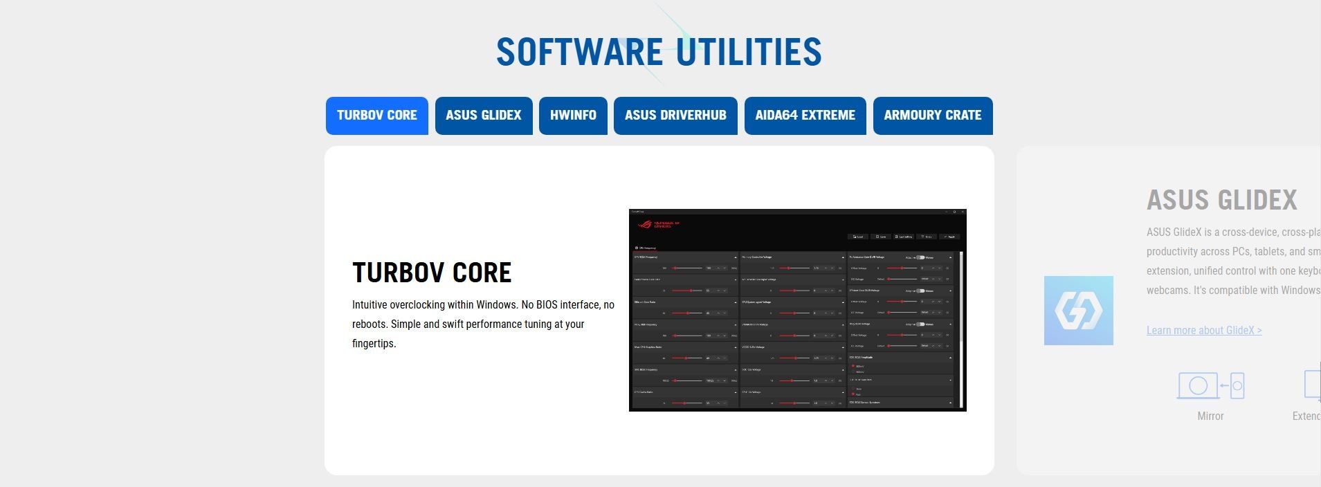 Software Features | ROG Exclusive Software - ROG CPU-Z - Dolby Atmos ASUS Exclusive Software Armoury Crate - Aura Creator - Aura Sync - Fan Xpert 4 - GameFirst - Power Saving AIDA64 Extreme (60 days free trial) HWiNFO ASUS AI Advisor ASUS DriverHub ASUS GlideX TurboV Core Adobe Creative Cloud 30 Days Free Trial) Norton 360 for Gamers (60 Days Free Trial) WinRAR (40 Days Free Trial) UEFI BIOS AI Overclocking Guide ASUS EZ DIY - ASUS CrashFree BIOS 3 - ASUS EZ Flash - ASUS UEFI BIOS EZ Mode - ASUS MyHotkey NPU Boost |
