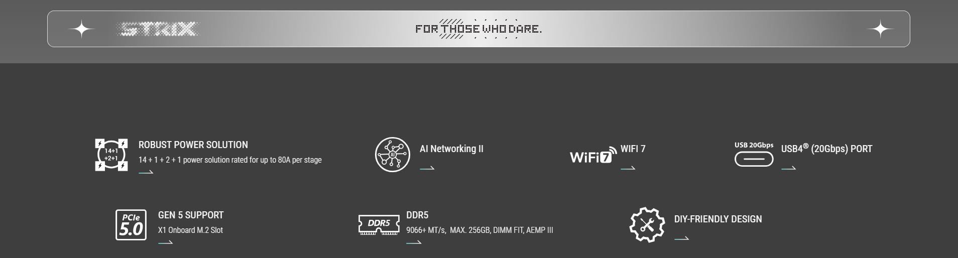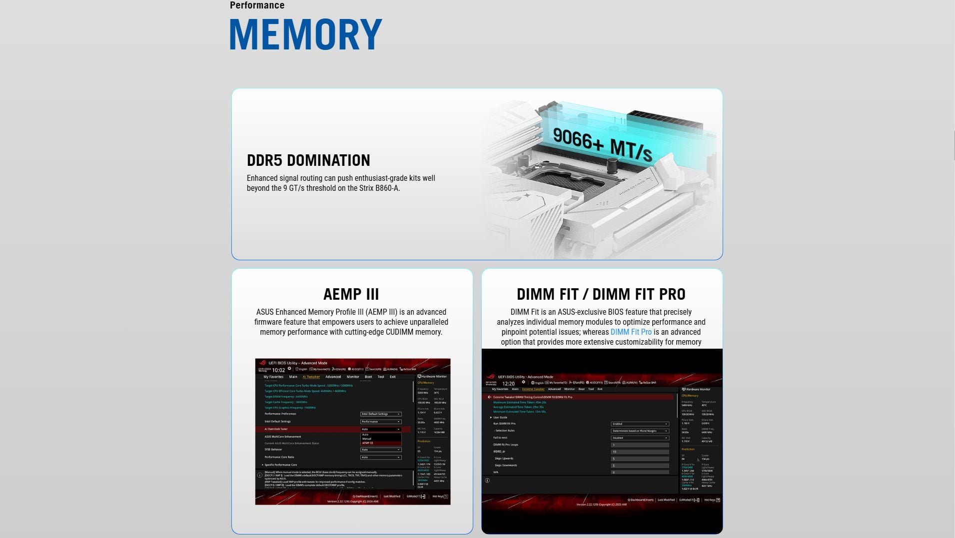 Memory | 4 x DIMM slots, max. 256GB, DDR5 Supports up to 8600+MT/s (OC), Non-ECC Un-buffered ,Clocked Unbuffered DIMM (CUDIMM)* Dual channel memory architecture DIMM Fit Supports Intel® Extreme Memory Profile (XMP) memory module ASUS Enhanced Memory Profile III(AEMPIII) * Supported memory types, data rate (speed), and number of DRAM modules vary depending on the CPU and memory configuration, for more information please refer to CPU/Memory Support list under the Support tab of product information site or visit https://www.asus.com/support/download-center/. ** Non-ECC, un-buffered DDR5 memory supports On-Die ECC function. |