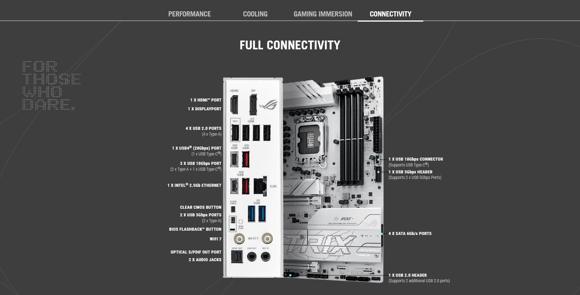Back Panel I/O Ports | 1 x USB4® (20Gbps) port (1 x USB Type-C®) 3 x USB 10Gbps ports (2 x Type-A + 1 x USB Type-C®) 2 x USB 5Gbps ports (2 x Type-A) 4 x USB 2.0 ports (4 x Type-A) 1 x DisplayPort 1 x HDMI™ port 1 x Wi-Fi module 1 x Intel® 2.5Gb Ethernet port 2 x Audio jacks 1 x Optical S/PDIF out port 1 x BIOS FlashBack™ button 1 x Clear CMOS button |