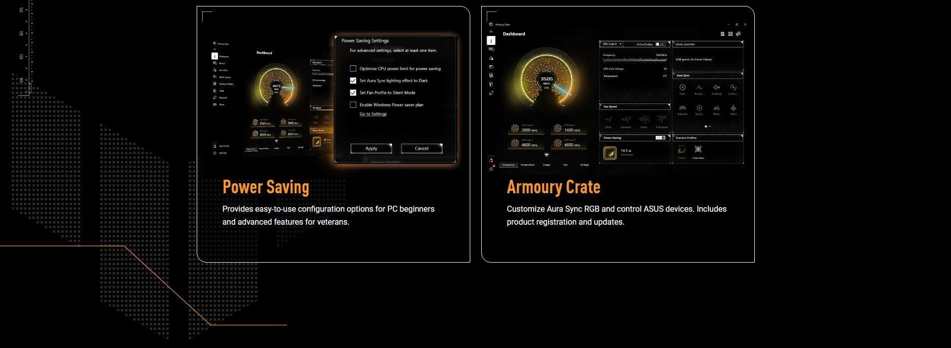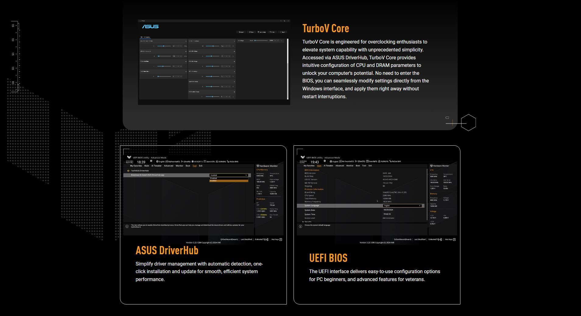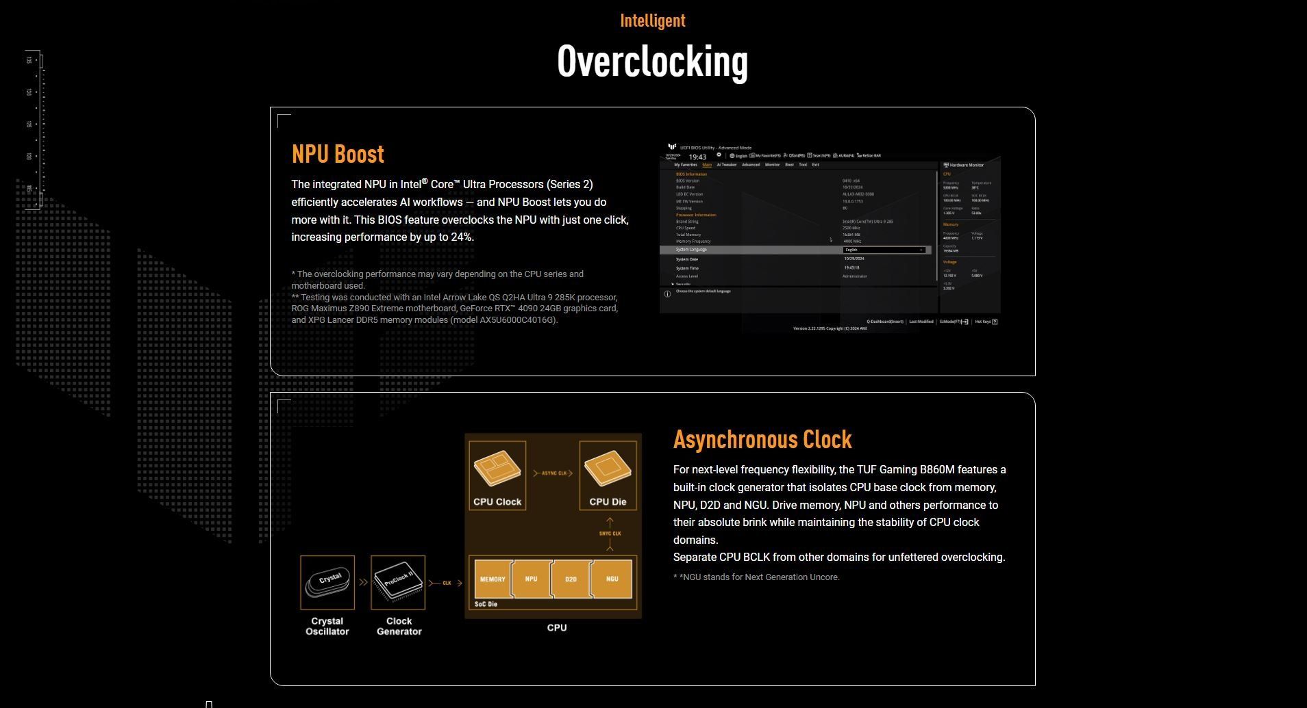 Software Features | ASUS Exclusive Software Armoury Crate - AURA Creator - AURA Sync - Fan Xpert 2+ - Power Saving ASUS DriverHub TurboV Core TUF GAMING CPU-Z DTS Audio Processing Norton 360 for Gamers (60 Days Free Trial) WinRAR (40 Days Free Trial) UEFI BIOS ASUS EZ DIY - ASUS CrashFree BIOS 3 - ASUS EZ Flash - ASUS UEFI BIOS EZ Mode - ASUS MyHotkey NPU Boost |