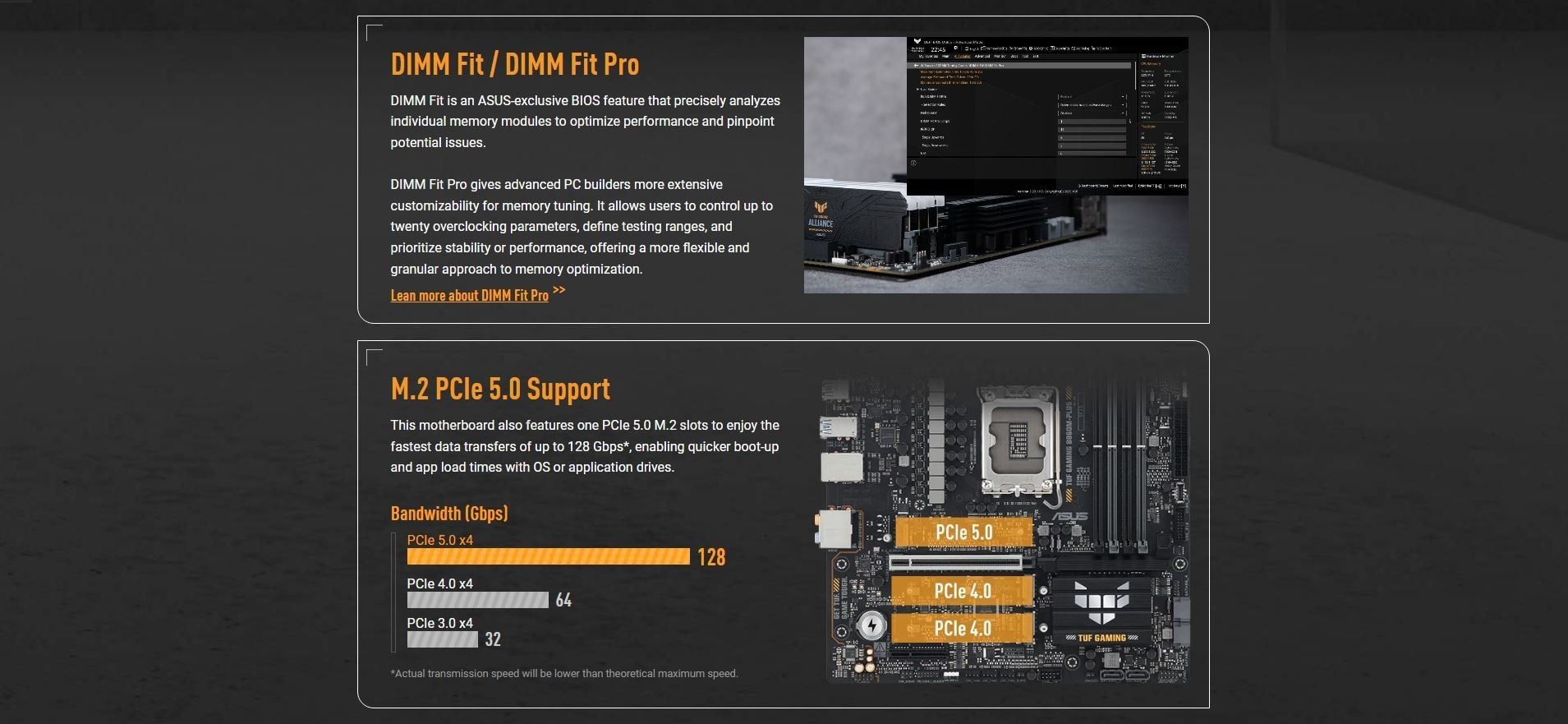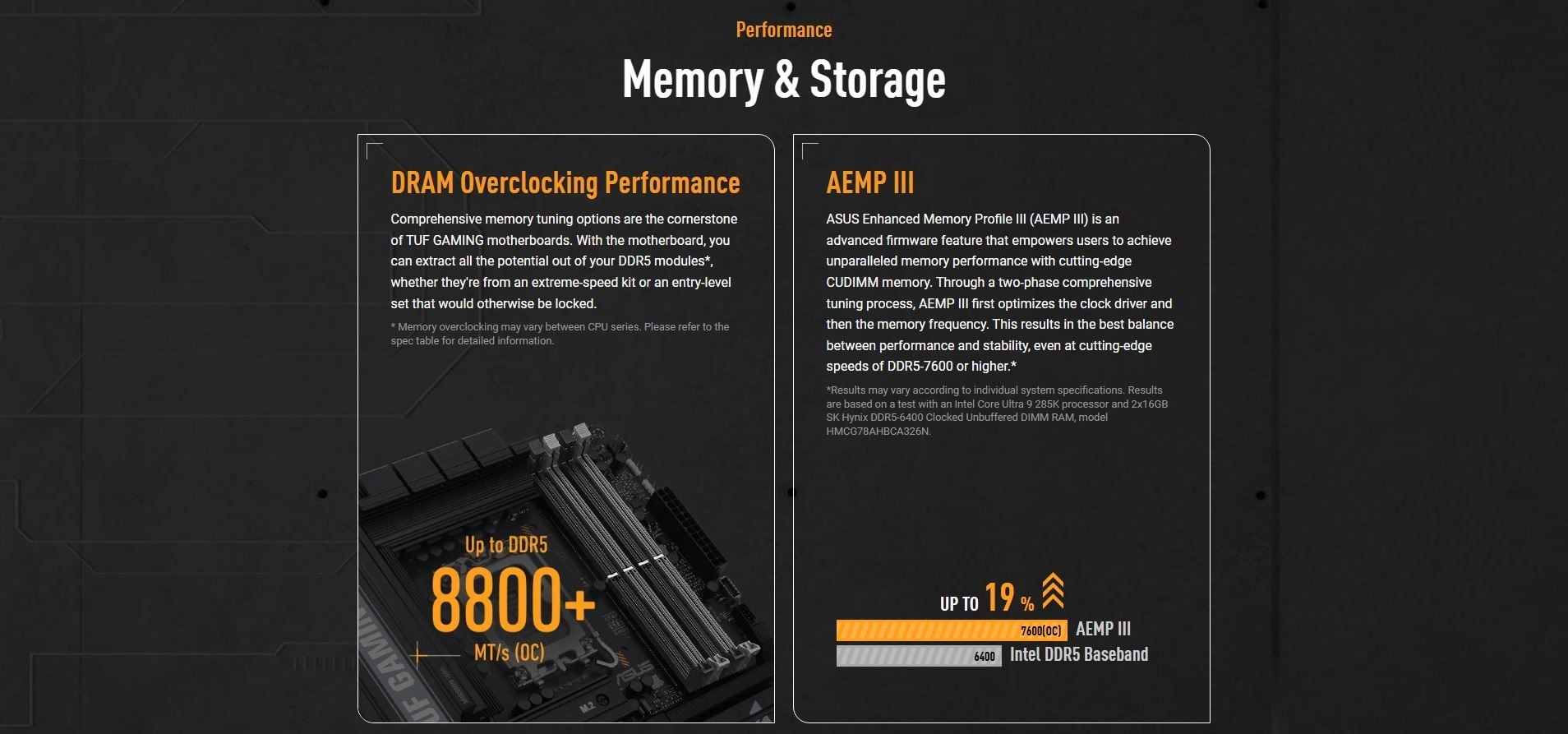 Memory | 4 x DIMM slots, max. 256GB, DDR5 Support up to 8800+MT/s (OC), Non-ECC,Un-buffered ,Clocked Unbuffered DIMM (CUDIMM)* Dual Channel Memory Architecture DIMM Fit Supports Intel® Extreme Memory Profile (XMP) memory module ASUS Enhanced Memory Profile III(AEMPIII) * Supported memory types, data rate (speed), and number of DRAM modules vary depending on the CPU and memory configuration, for more information please refer to CPU/Memory Support list under the Support tab of product information site or visit https://www.asus.com/support/download-center/. * Non-ECC, un-buffered DDR5 memory supports On-Die ECC function. |