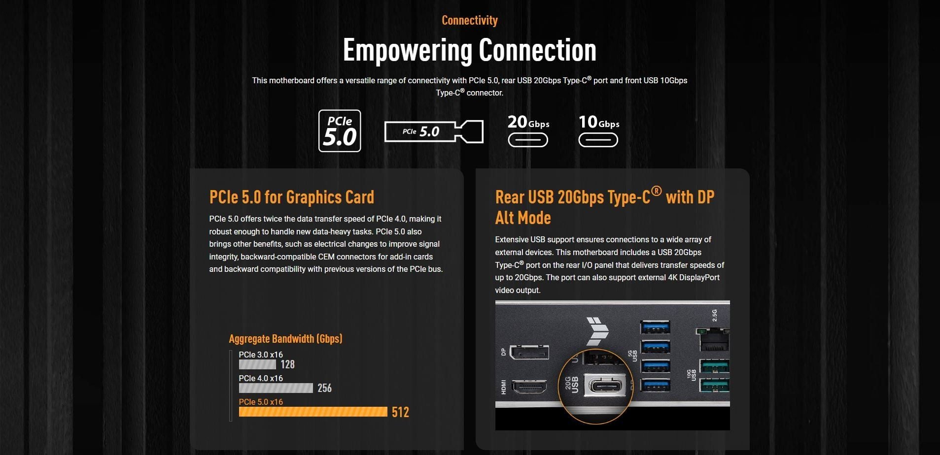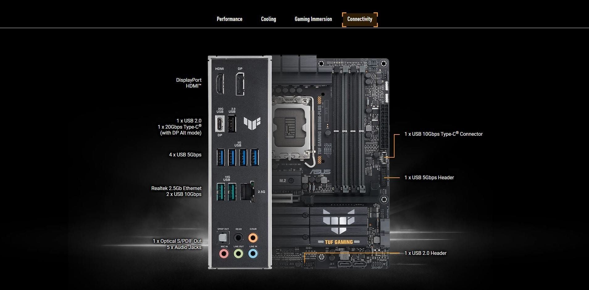 Back Panel I/O Ports | 1 x USB 20Gbps port (1 x USB Type-C® with DP Alt mode) 2 x USB 10Gbps port (2 x Type-A) 4 x USB 5Gbps ports (4 x Type-A) 1 x USB 2.0 port (1 x Type-A) 1 x DisplayPort 1 x HDMI™ port 1 x Realtek 2.5Gb Ethernet port 5 x Audio jacks 1 x Optical S/PDIF out port |