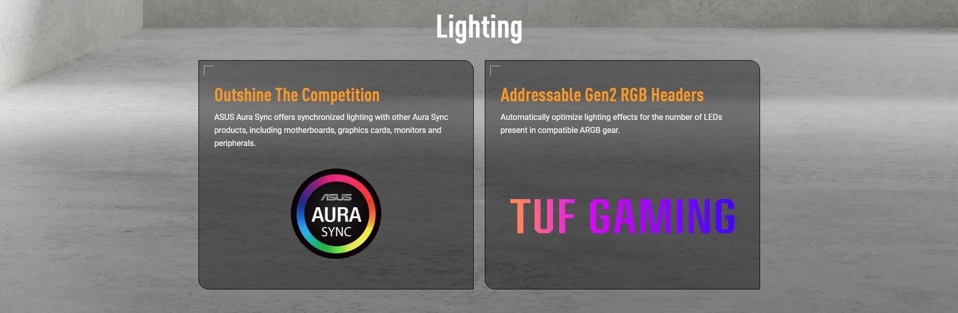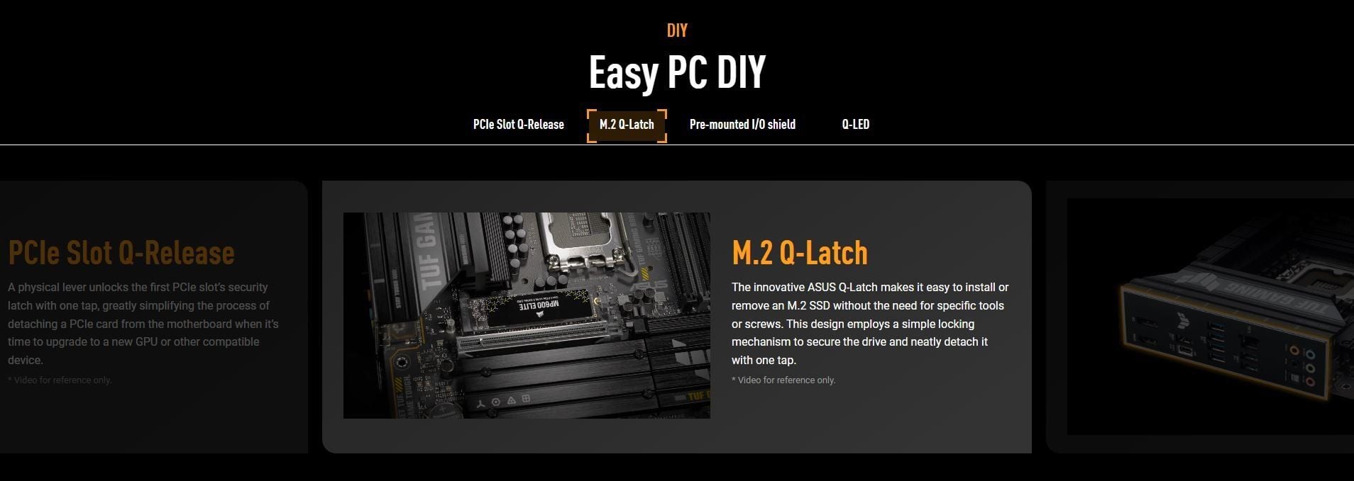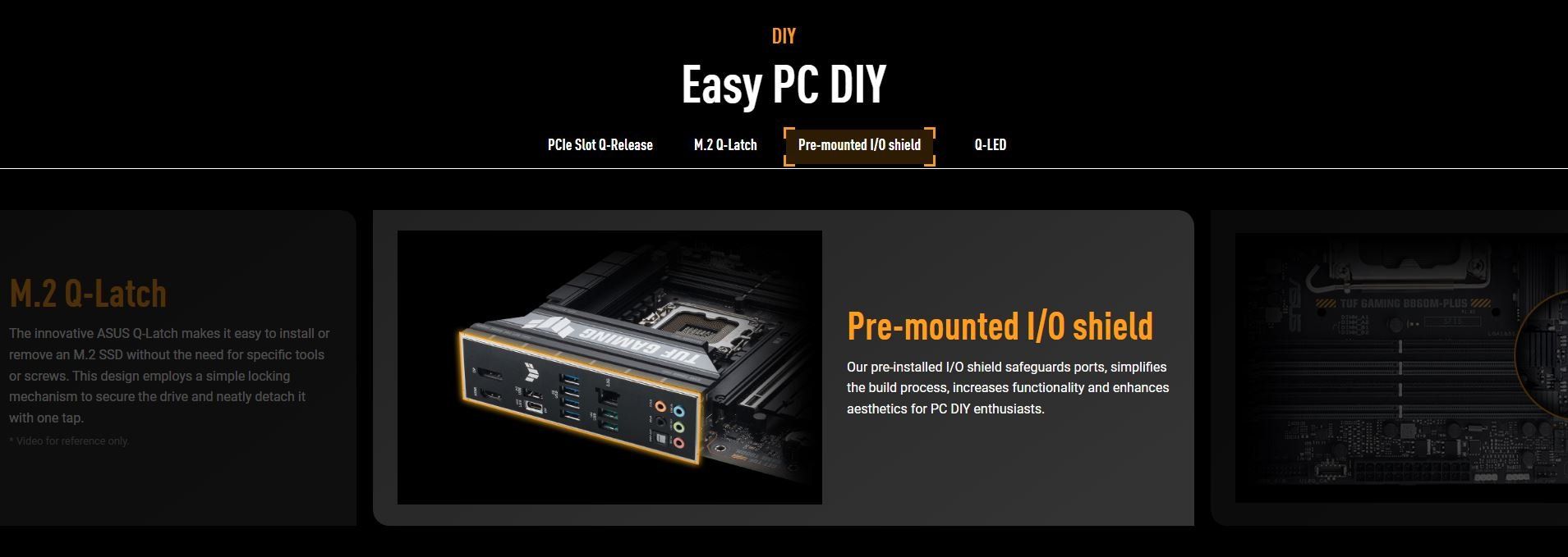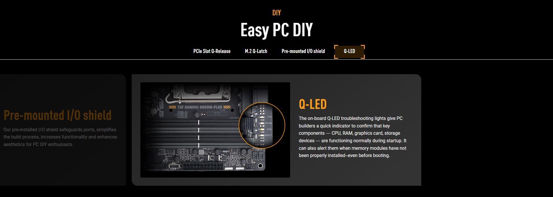 Special Features | ASUS TUF PROTECTION - DIGI+ VRM (- Digital power design with DrMOS) - ESD Guards - TUF LANGuard - Overvoltage Protection - SafeSlot - Stainless-Steel Back I/O ASUS Q-Design - M.2 Q-Latch - PCIe Slot Q-Release - Q-Dashboard - Q-DIMM - Q-LED (CPU [red], DRAM [yellow], VGA [white], Boot Device [yellow green]) ASUS Thermal Solution - M.2 heatsinks - VRM heatsink design ASUS EZ DIY - CPU Socket lever protector - ProCool - Pre-mounted I/O shield - SafeDIMM AURA Sync - Addressable Gen 2 headers |