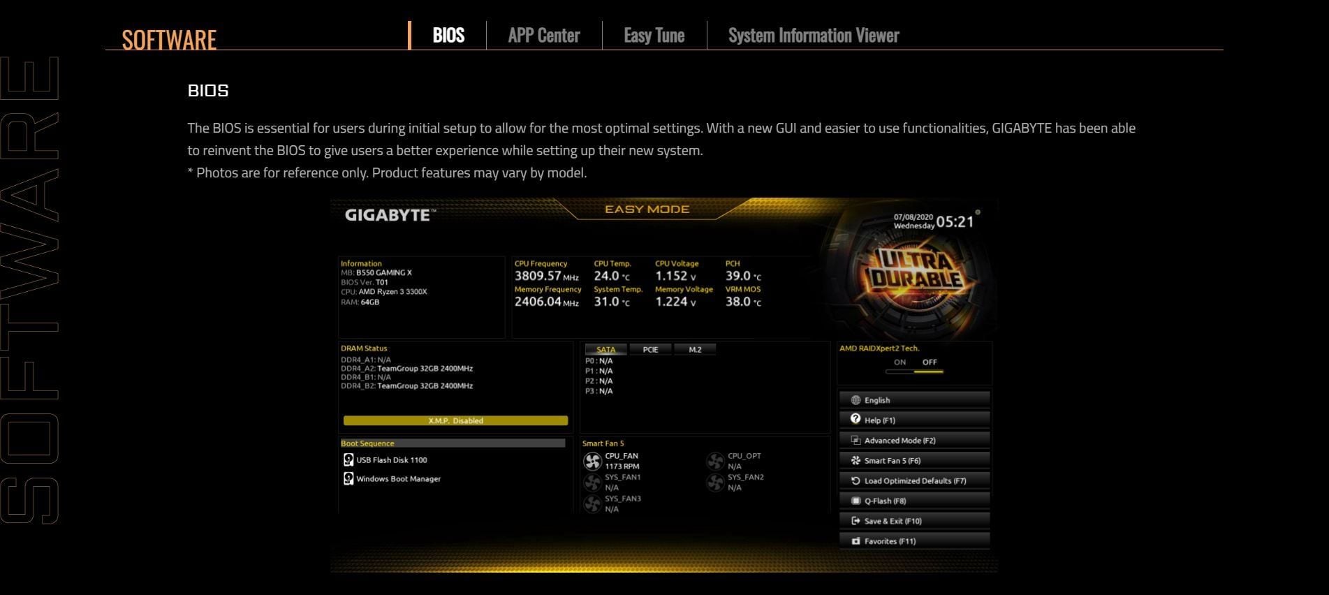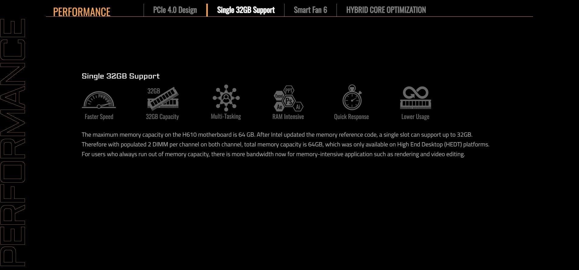 Memory | Support for DDR4 3200/3000/2933/2666/2400/2133 MT/s memory modules 2 x DDR4 DIMM sockets supporting up to 64 GB (32 GB single DIMM capacity) of system memory Dual channel memory architecture Support for ECC Un-buffered DIMM 1Rx8/2Rx8 memory modules (operate in non-ECC mode) Support for non-ECC Un-buffered DIMM 1Rx8/2Rx8/1Rx16 memory modules Support for Extreme Memory Profile (XMP) memory modules (The CPU and memory configuration may affect the supported memory types, data rate (speed), and number of DRAM modules, please refer to "Memory Support List" on GIGABYTE's website for more information.) |