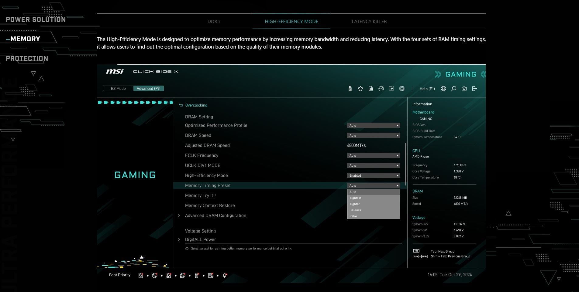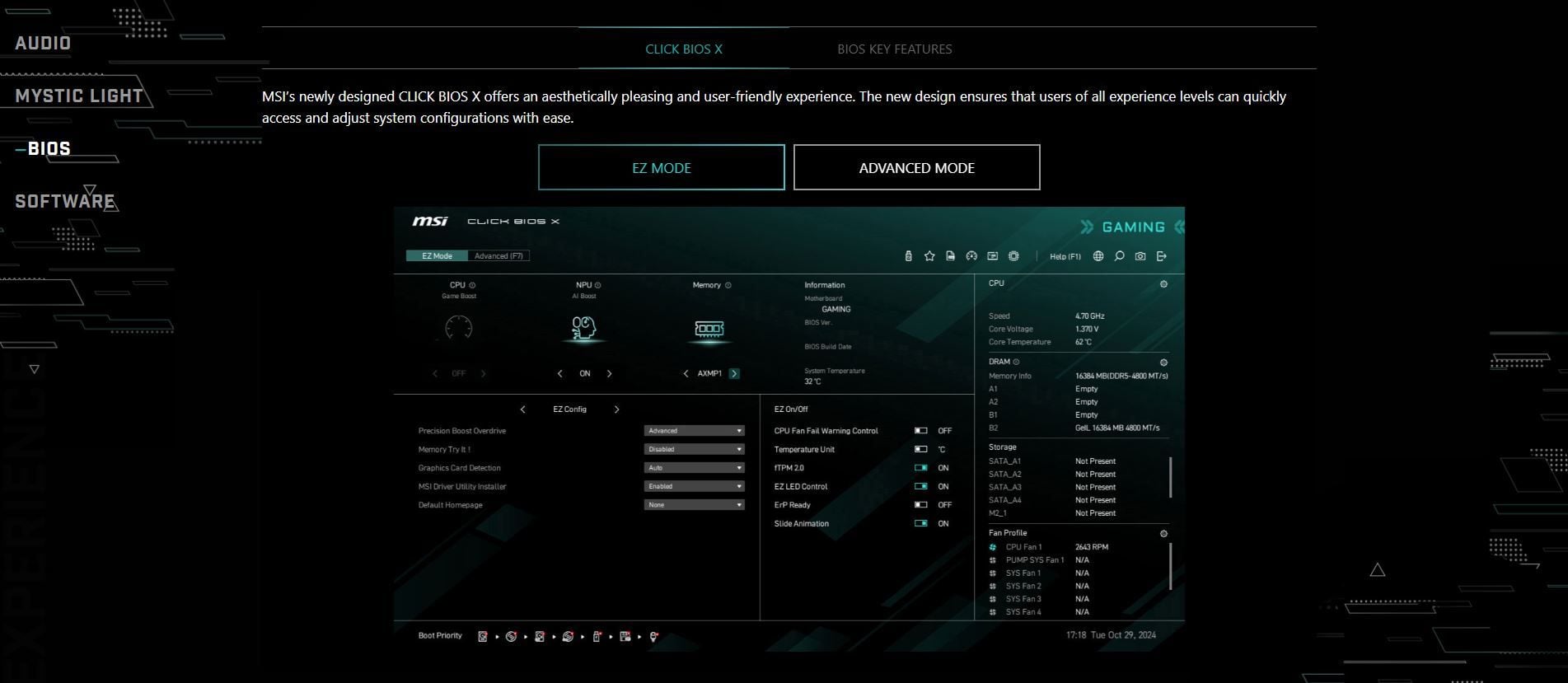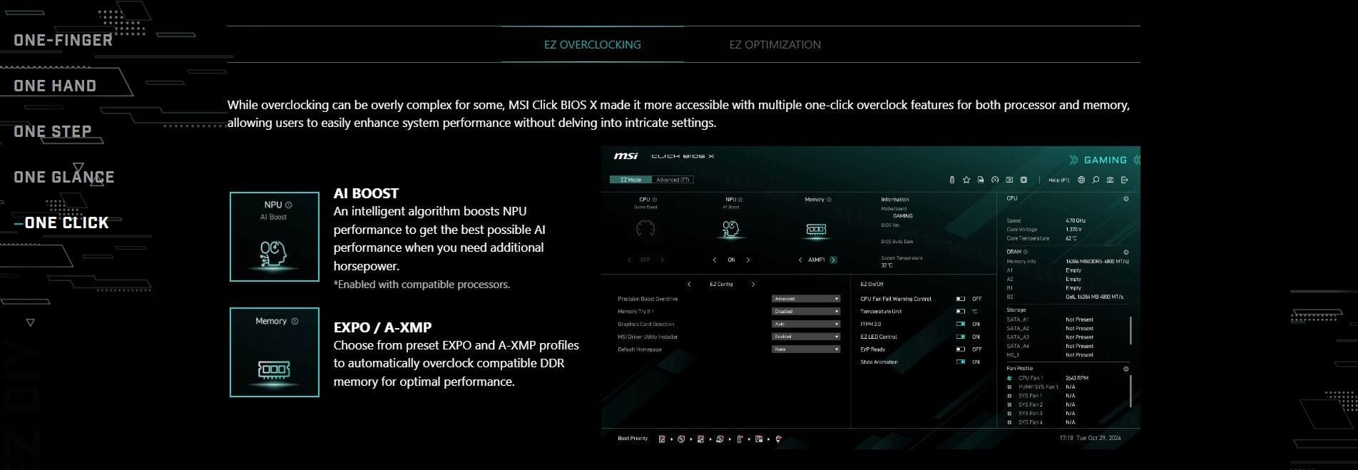 MEMORY | 4x DDR5 UDIMM, Maximum Memory Capacity 256GB Memory Support DDR5 8000 - 5600 (OC) MT/s / 5600 - 4800 (JEDEC) MT/s Ryzen™ 9000 Series Processors max. overclocking frequency: • 1DPC 1R Max speed up to 8000+ MT/s • 1DPC 2R Max speed up to 6400+ MT/s • 2DPC 1R Max speed up to 6400+ MT/s • 2DPC 2R Max speed up to 5600+ MT/s Supports AMD POR Speed and JEDEC Speed Supports Memory Overclocking and AMD EXPOTM Supports Dual-Channel mode Supports Non-ECC, Un-buffered memory Supports CUDIMM, Clock Driver bypass mode only* * CUDIMM support and POR boot frequency may vary by CPU series, with manual overclocking available after boot. Certain CPUs may fail to boot, but future BIOS updates will improve compatibility. • Memory compatibility and supported speeds can vary depending on the CPU and memory configuration. For detailed information, please refer to the Memory Compatibility List available on the product’s Support page or visit https://www.msi.com/support/. | |