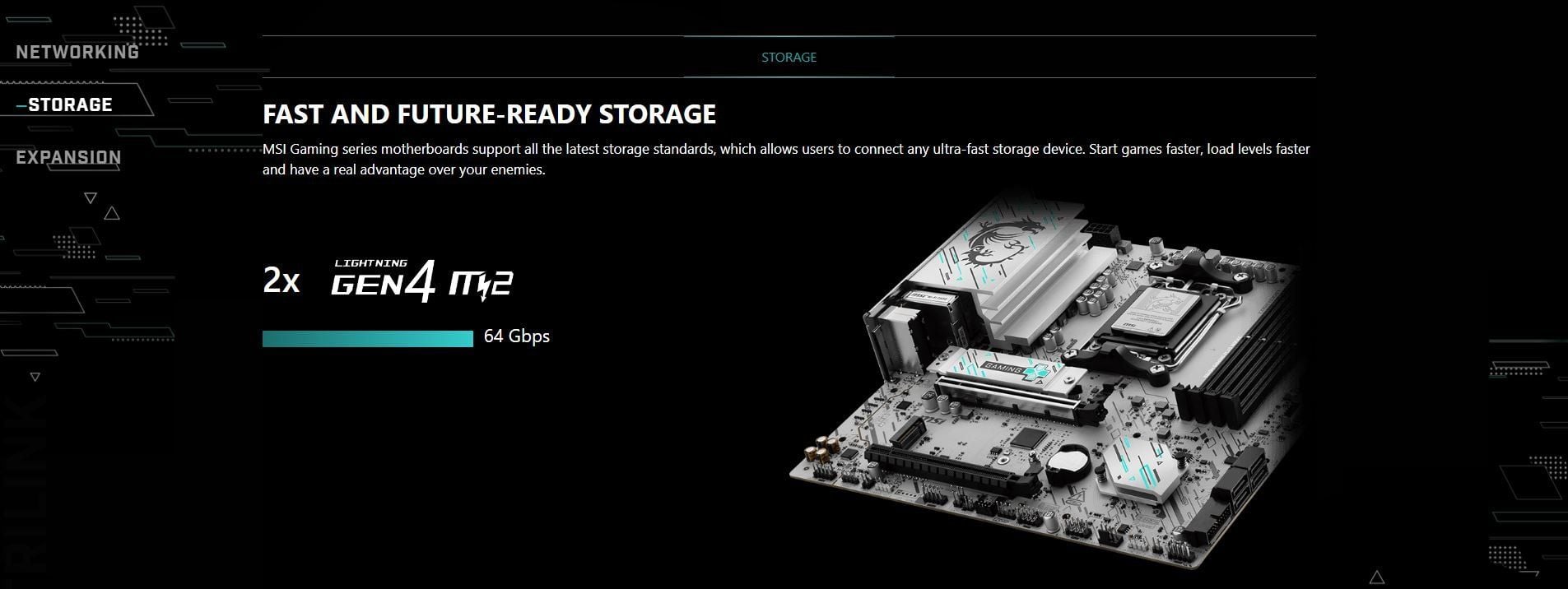 STORAGE | 2x M.2 M.2_1 Source (From CPU) supports up to PCIe 4.0 x4 , supports 2280/2260 devices M.2_2 Source (From CPU) supports up to PCIe 4.0 x4 , supports 2280/2260 devices 4x SATA 6G *Please refer to the manual for M.2 SSD heatsink restrictions. | |