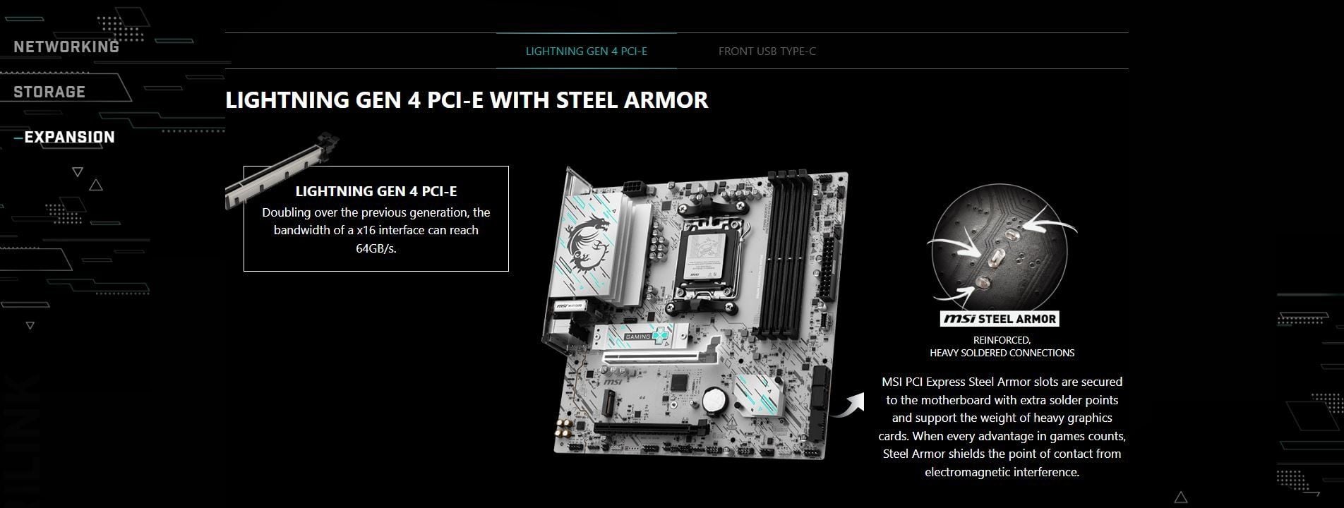 SLOT | 2x PCI-E x16 slot PCI_E1 Gen PCIe 4.0 supports up to x16 (From CPU) PCI_E2 Gen PCIe 3.0 supports up to x4 (From Chipset) PCI_E1 slot • Supports PCIe 4.0 x16 (For Ryzen™ 9000/ 7000 Series processors) • Supports PCIe 4.0 x8 (For Ryzen™ 8700/ 8600/ 8400 Series processors) • Supports PCIe 4.0 x4 (For Ryzen™ 8500/ 8300 Series processor) | |
