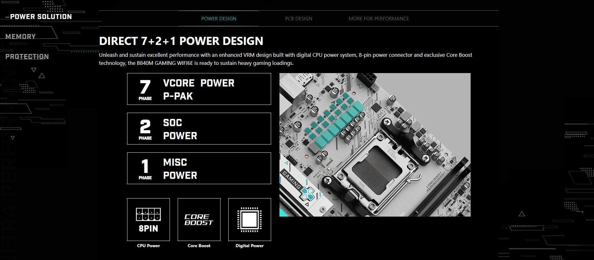 SLOT | 2x PCI-E x16 slot PCI_E1 Gen PCIe 4.0 supports up to x16 (From CPU) PCI_E2 Gen PCIe 3.0 supports up to x4 (From Chipset) PCI_E1 slot • Supports PCIe 4.0 x16 (For Ryzen™ 9000/ 7000 Series processors) • Supports PCIe 4.0 x8 (For Ryzen™ 8700/ 8600/ 8400 Series processors) • Supports PCIe 4.0 x4 (For Ryzen™ 8500/ 8300 Series processor) | |