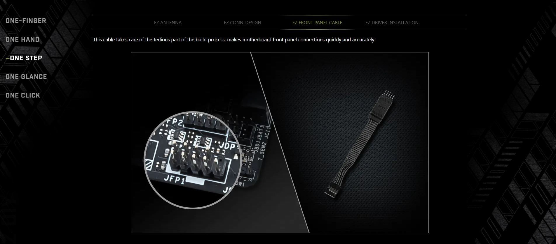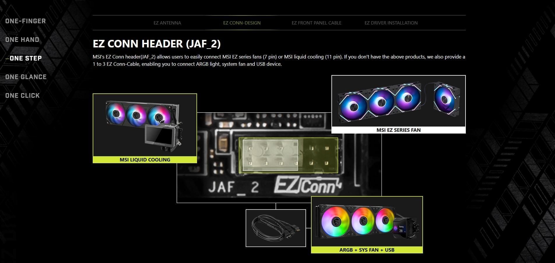 INTERNAL I/O | 1x Power Connector(ATX_PWR) 2x Power Connector(CPU_PWR) 1x Power Connector(PCIE_PWR 8pin) 1x CPU Fan 1x Combo Fan (Pump_Sys Fan) 6x System Fan 1x EZ Conn-header (JAF_2) 2x Front Panel (JFP) 1x Chassis Intrusion (JCI) 1x Front Audio (JAUD) 3x Addressable V2 RGB LED connector (JARGB_V2) 1x RGB LED connector(JRGB) 1x TPM pin header(Support TPM 2.0) 4x USB 2.0 ports 4x USB 5Gbps Type A ports 1x USB 20Gbps Type C ports | |