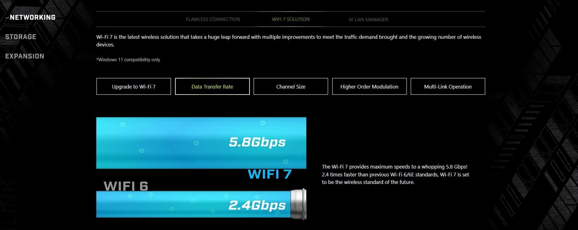 WIRELESS LAN & BLUETOOTH | Wi-Fi 7 The Wireless module is pre-installed in the M.2 (Key-E) slot Supports MU-MIMO TX/RX, 2.4GHz/ 5GHz/ 6GHz* (320MHz) up to 5.8Gbps Supports 802.11 a/ b/ g/ n/ ac/ ax/ be Supports Bluetooth® 5.4**, MLO, 4KQAM * 6GHz band support may depend on every country’s regulations and Wi-Fi 7 will be ready in Windows 11 version 24H2. ** The Bluetooth version may be updated, please refer to the Wi-Fi chipset vendor’s website for details. Bluetooth 5.4 will be ready in Windows 11 version 24H2. | |