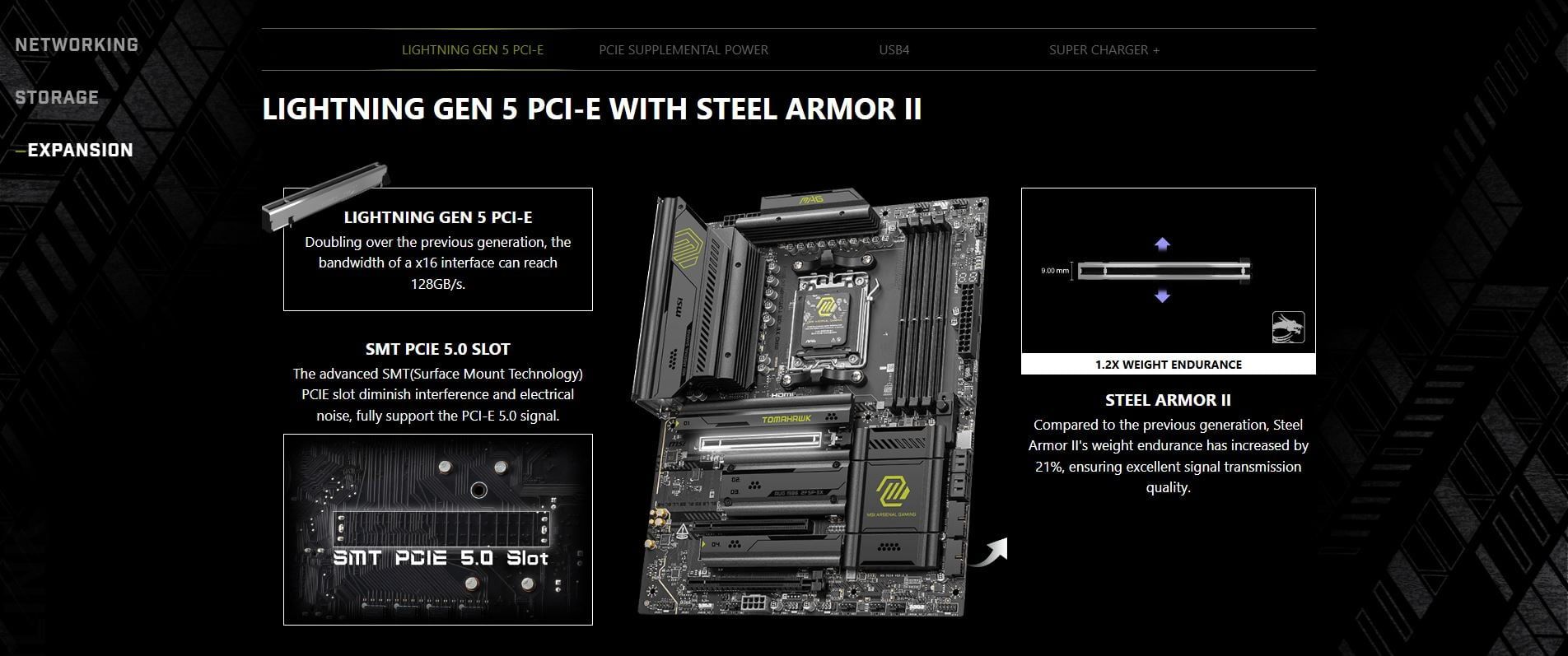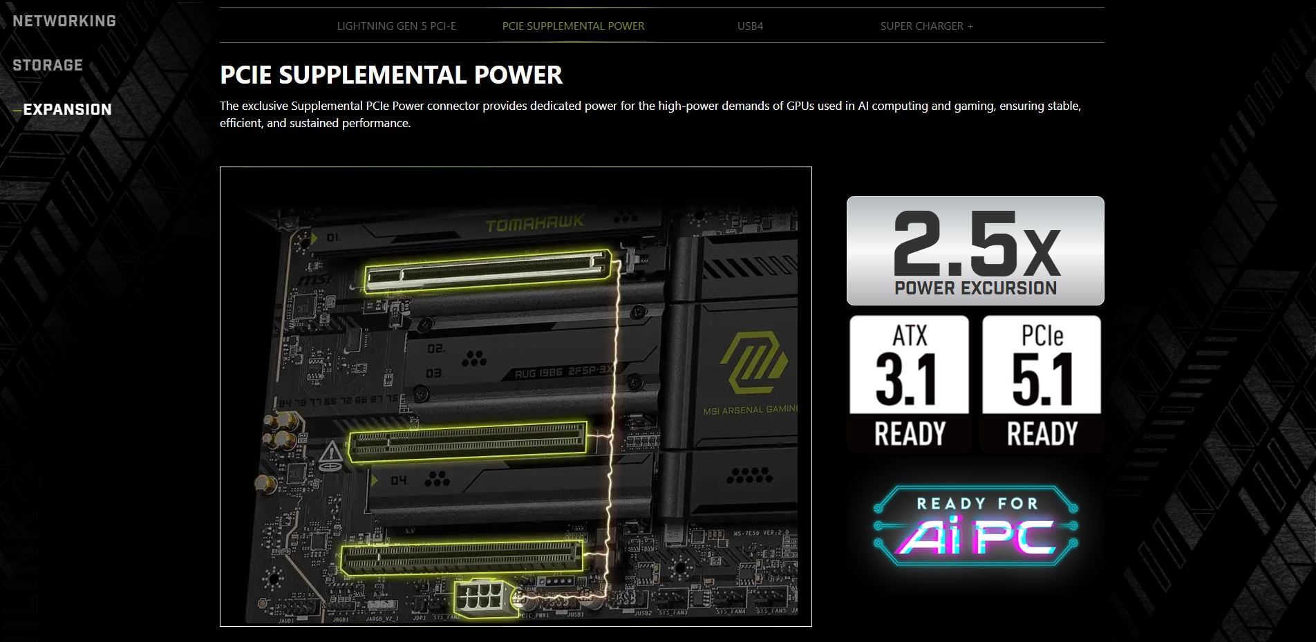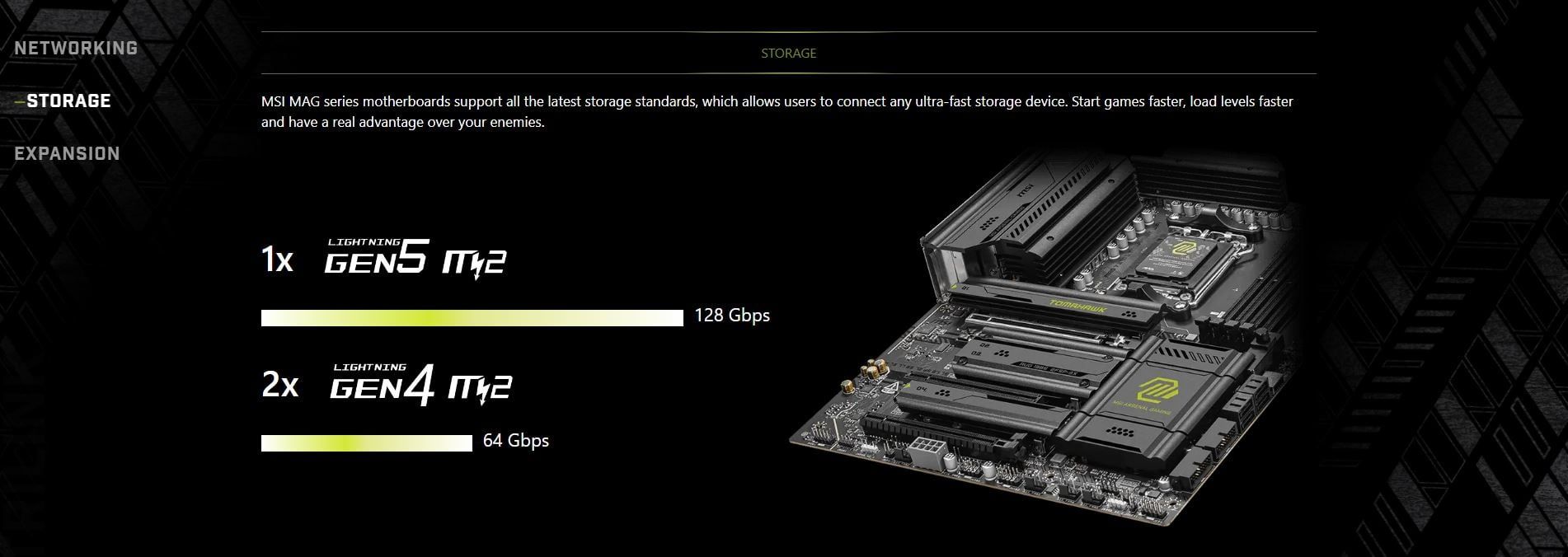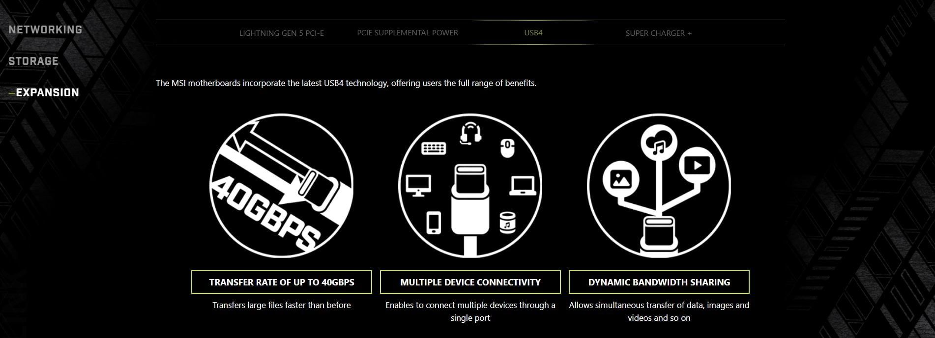 | Storage | 4x M.2 M.2_1 Source (From CPU) supports up to PCIe 5.0 x4 , supports 22110/2280 devices M.2_2 Source (From CPU) supports up to PCIe 5.0 x4 , supports 2280/2260 devices M.2_3 Source (From Chipset) supports up to PCIe 4.0 x4 , supports 2280/2260 devices M.2_4 Source (From Chipset) supports up to PCIe 4.0 x4 , supports 2280/2260 devices 4x SATA 6G M.2_1 slot (From CPU) • Supports up to PCIe 5.0 x4 (For Ryzen™ 9000/ 7000 Series processors) • Supports up to PCIe 4.0 x4 (For Ryzen™ 8000 Series processors) M.2_2 slot (From CPU) • Supports up to PCIe 5.0 x4 (For Ryzen™ 9000/ 7000 Series processors) • Supports up to PCIe 4.0 x4 (For Ryzen™ 8700/ 8600/ 8400 Series processors) *The M2_2 slot will be unavailable when using Ryzen™ 8500/ 8300 Series processors. **USB 40Gbps Type-C ports on the back panel and M2_2 slot share PCIe 5.0 x4 bandwidth. Both run at PCIe 5.0 x2 when a device is installed in the M2_2 slot. You can switch M2_2 to PCIe 5.0 x4 in the BIOS, but this will disable the USB 40Gbps Type-C ports. The USB4 host controller supports up to PCIe 4.0 x4. | |